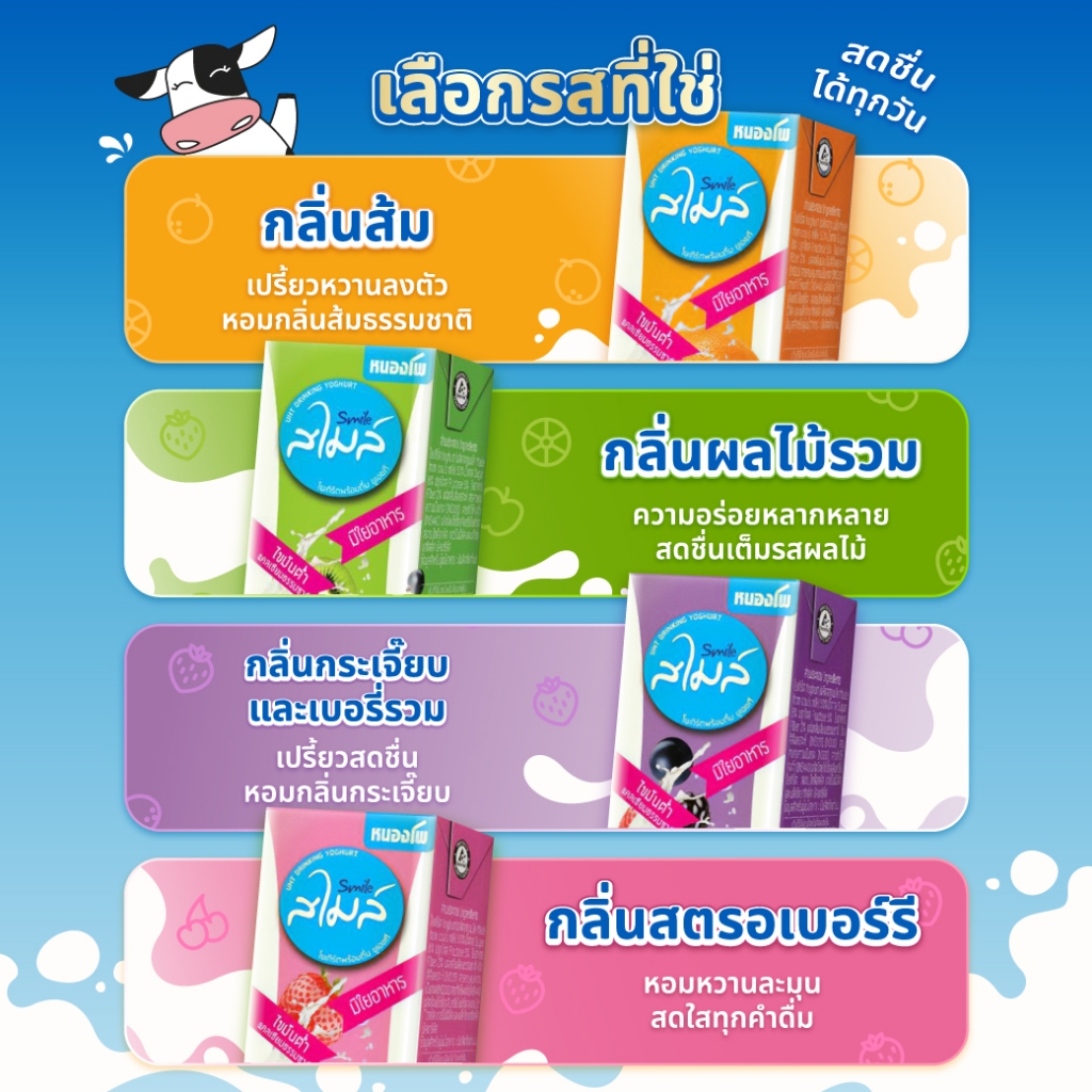 นมหนองโพสไมล์ โยเกิร์ตพร้อมดื่ม นมโคแท้100% นมยูเอชที 180ml (36 กล่อง/ลัง)