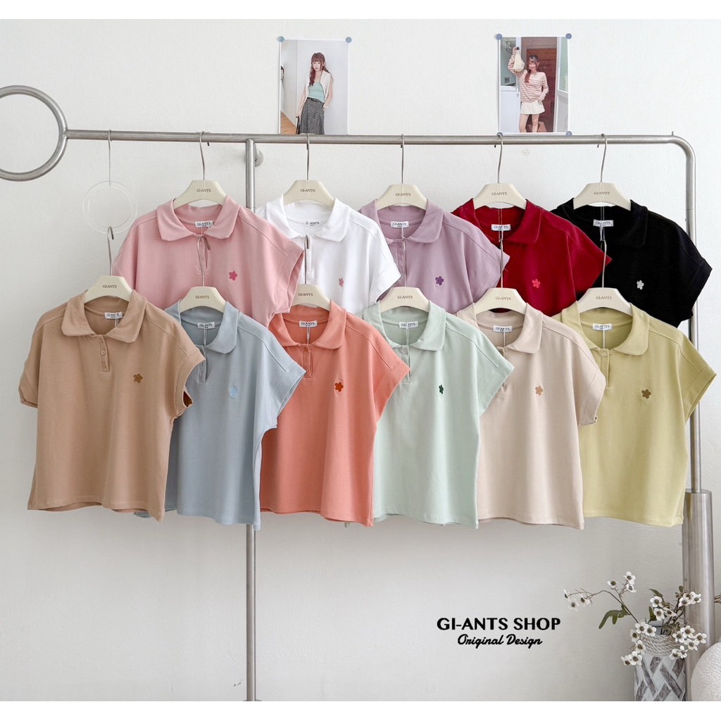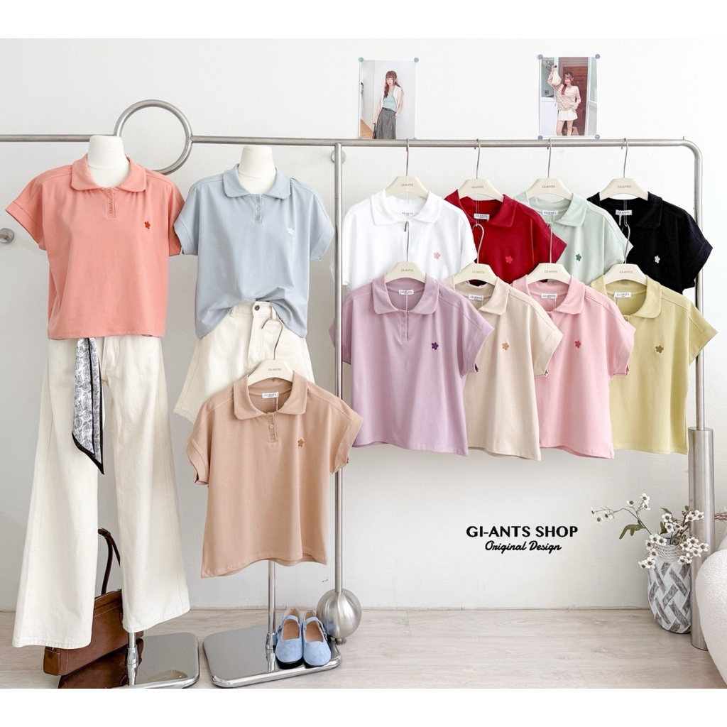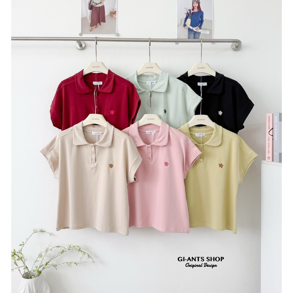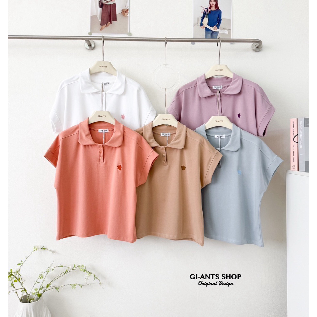 GI-ANTS(GI-437) เสื้อยืดคอปก oversize งานปักดอกไม้ (บาน)สุดน่ารัก