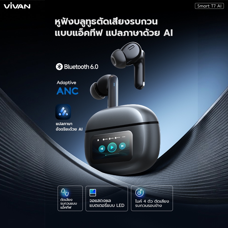 [รุ่นใหม่ 2026] VIVAN Smart T7 หูฟัง AI แปลภาษาได้แบบ Real-time หูฟังบลูทูธ 6.0 ตัดเสียงรบกวน Adaptive ANC มีหน้าจอ LED