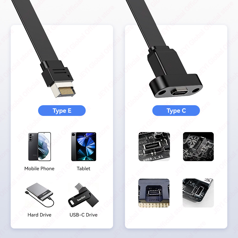 JEYI แผงด้านหน้า Header USB-C ถึง Type-E สายไฟ 20Gbps สายต่อเมนบอร์ดตัวเชื่อมต่อ USB + สกรูเมาท์แผง