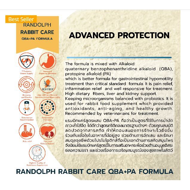 RANDOLPH RABBIT CARE แรนดอล์ฟ อาหารเสริมพลังงานกระต่ายป่วย สูตร QBA+PA (70 กรัม)
