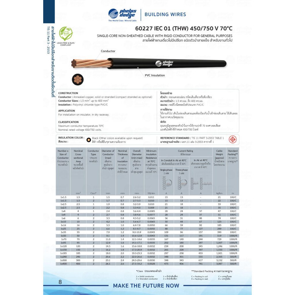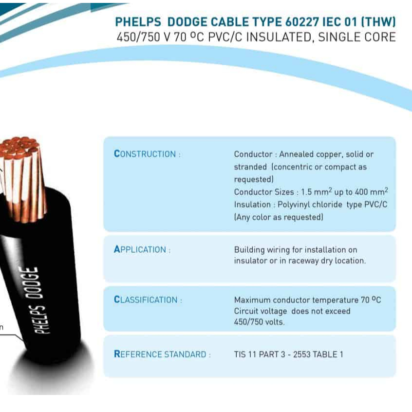 Phelps Dodge PD สายไฟทองแดง THW IEC01 1x1.5,1x2.5 sqmm (แบ่งขาย 30/50/100 เมตร) สายไฟมอก.