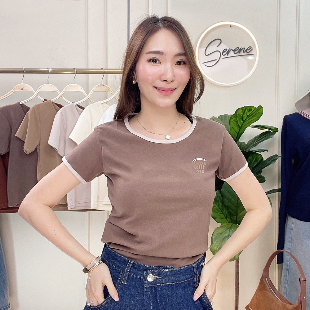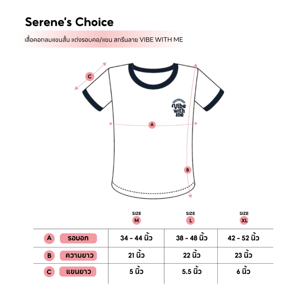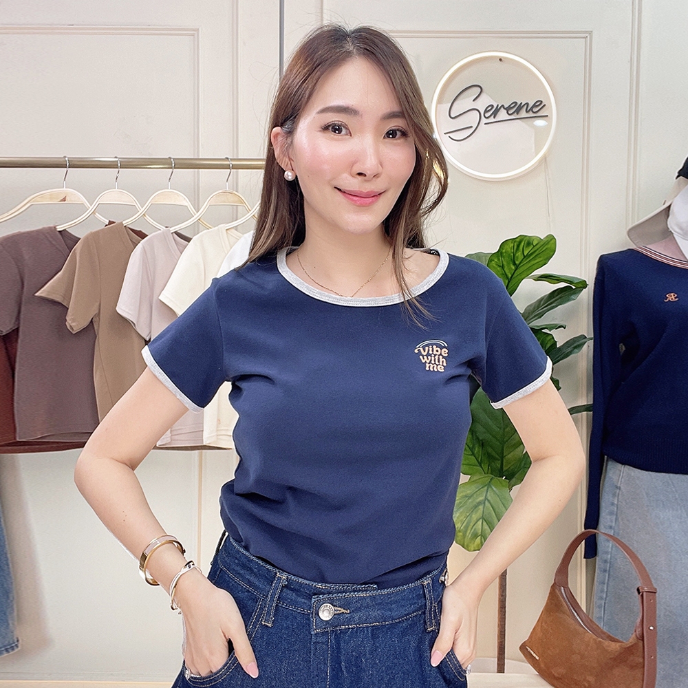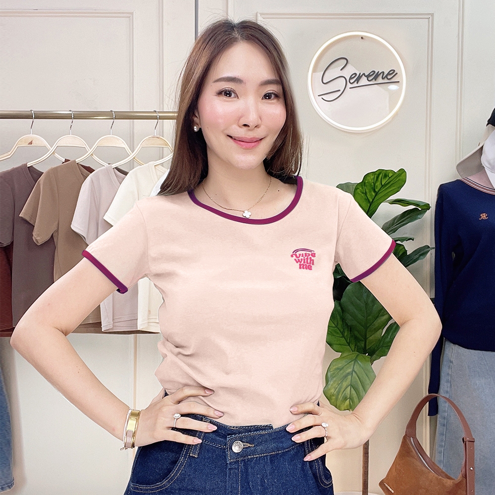 Serene's Choice เสื้อคอกลม แขนสั้น ผู้หญิง แต่งรอบคอและแขน สกรีนลาย VIBE WITH ME