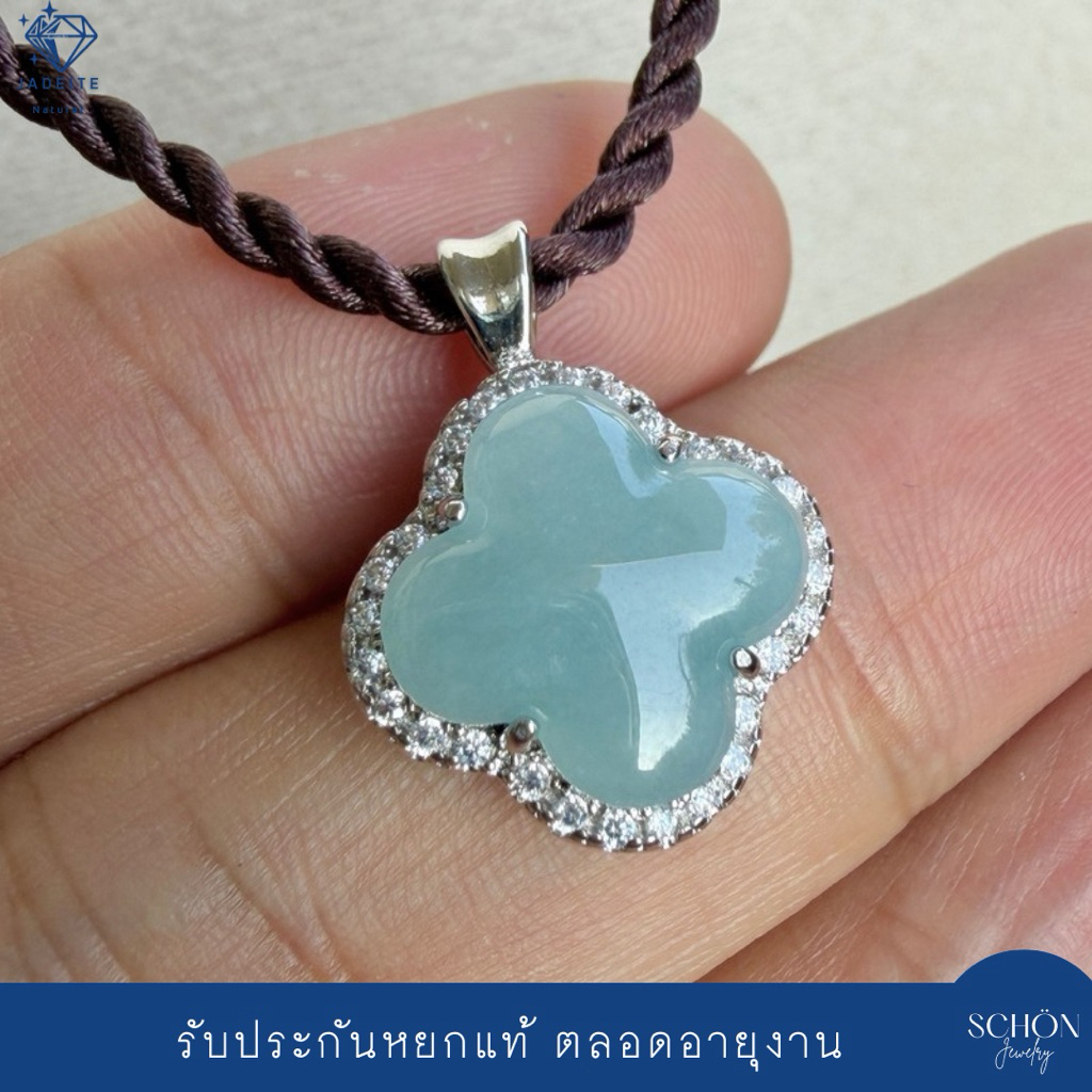 จี้หยกบลู จี้ใบโคเวอร์ หยกแกะสลัก Jadeite Type A ตัวเรือนอัลลอย รับประกันหยกแท้ตลอดอายุงาน 4JA-CLO.AL-JA.SK