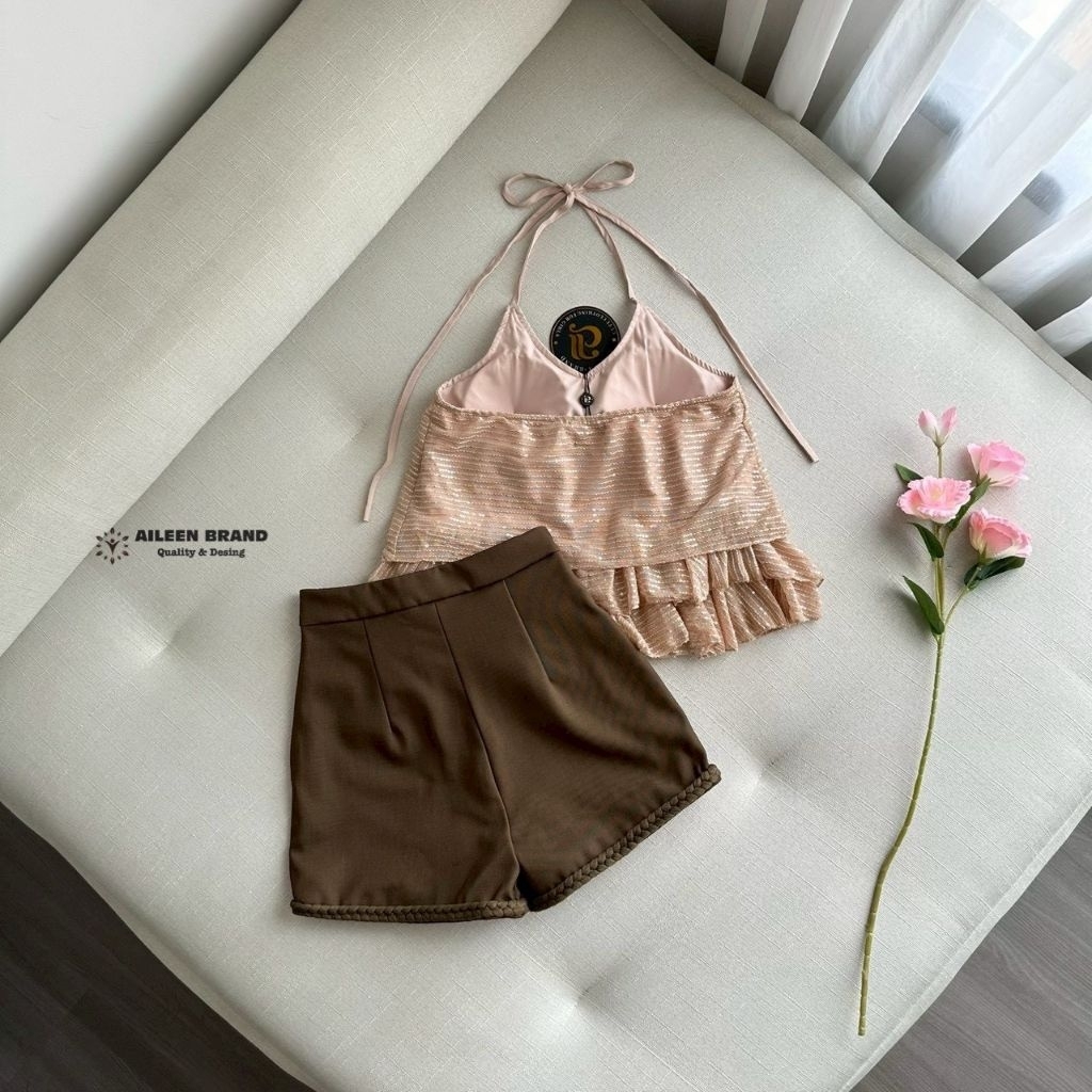Aileen Set.2ชิ้นเสื้อผูกสายคล้องคอสีน้ำตาลปักเลื่อมทั้งตัว ดีเทลแต่งระบายชั้นๆ ช่วงตัว ดีไซน์ปล่อยๆ