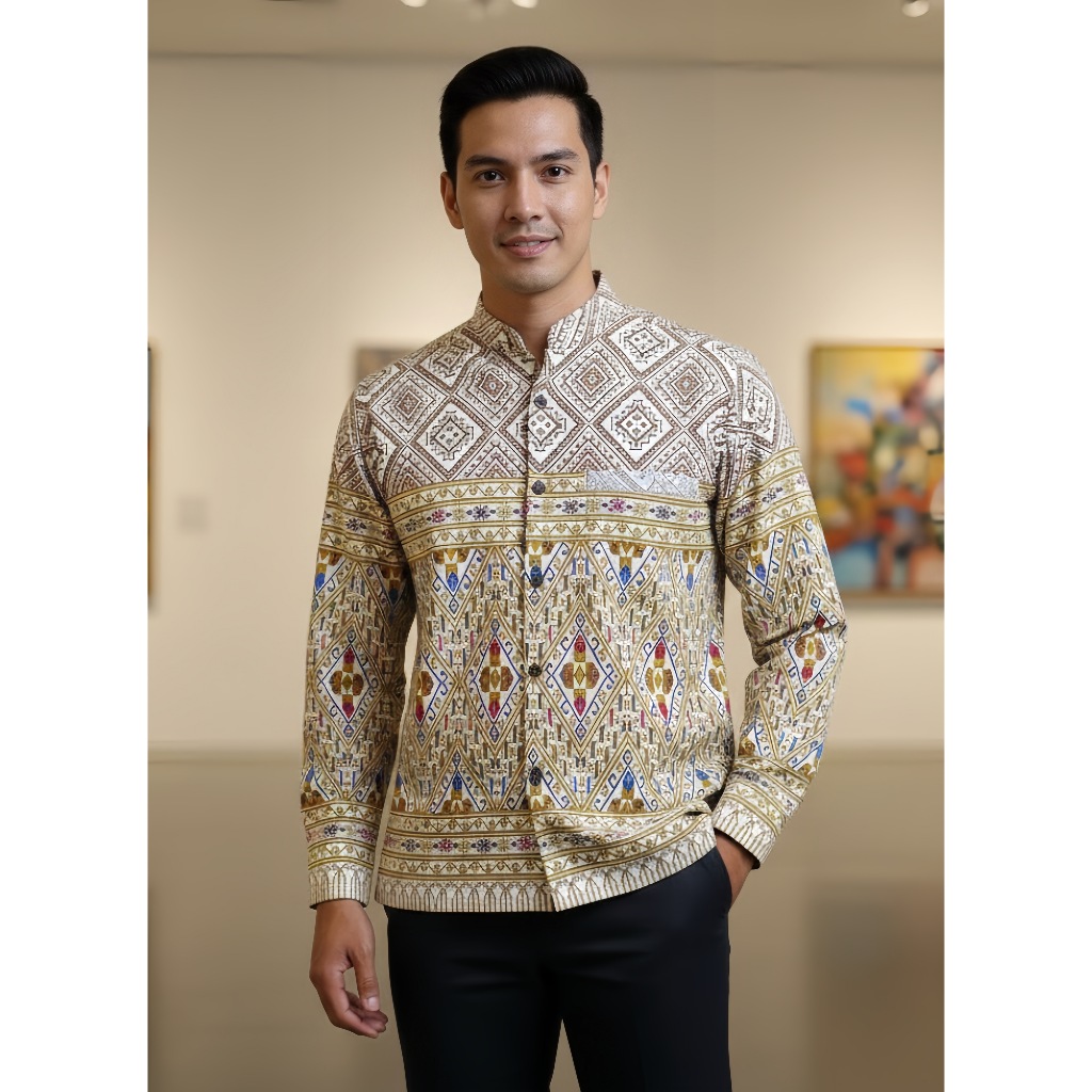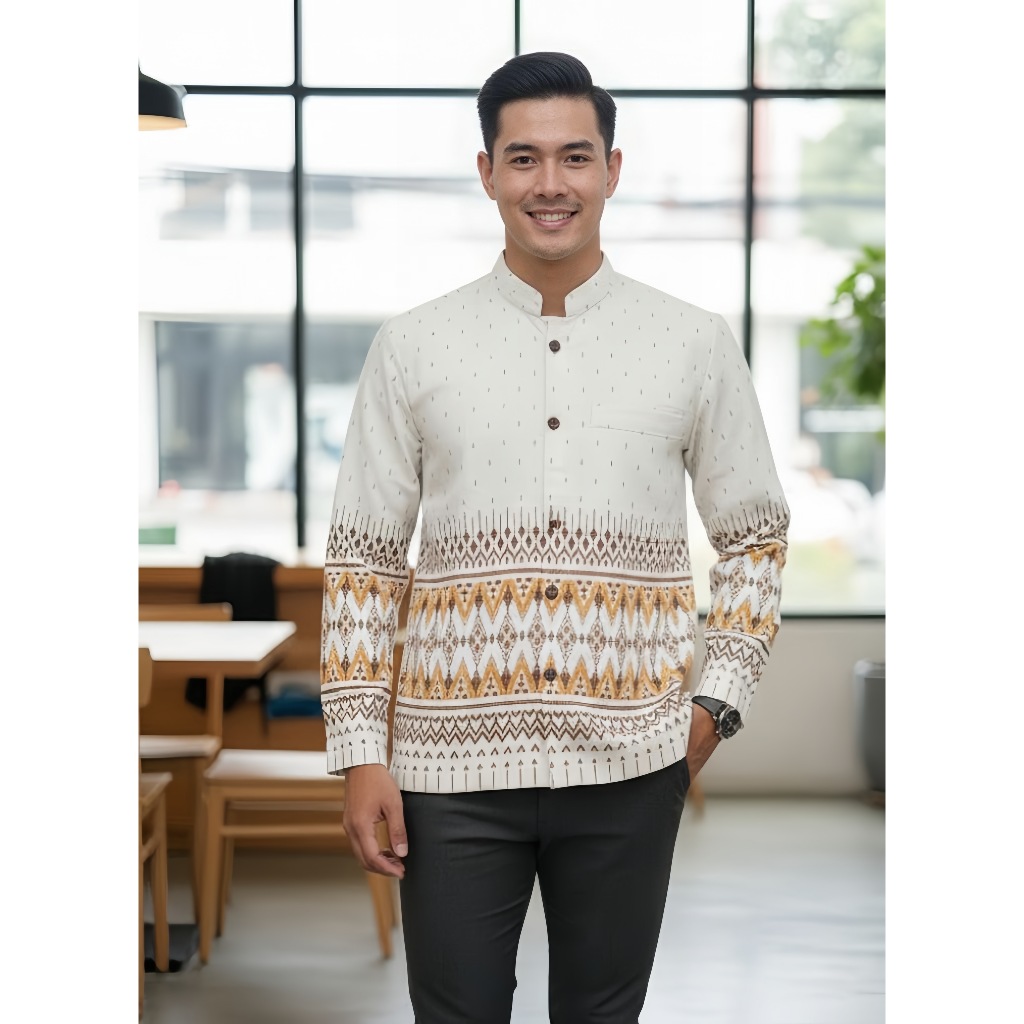 เสื้อลายไทยผู้ชายแขนยาว เนื้อผ้าฝ้ายพิมพ์ลายหมักโคลน โทนสีขาว