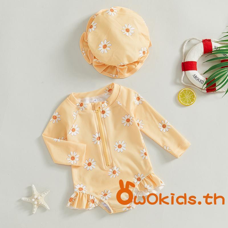 【ส่งบางส่วนจากประเทศไทย】ชุดว่ายน้ำทารกแขนยาวลายดอกไม้ พิมพ์สวยงาม มาพร้อมหมวก สำหรับอาบน้ำในฤดูร้อน