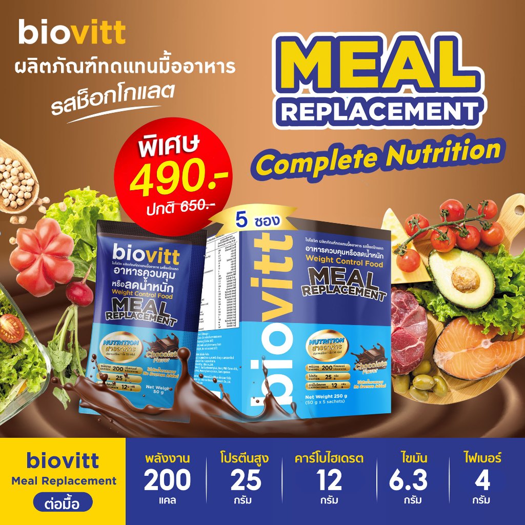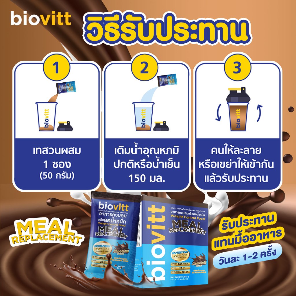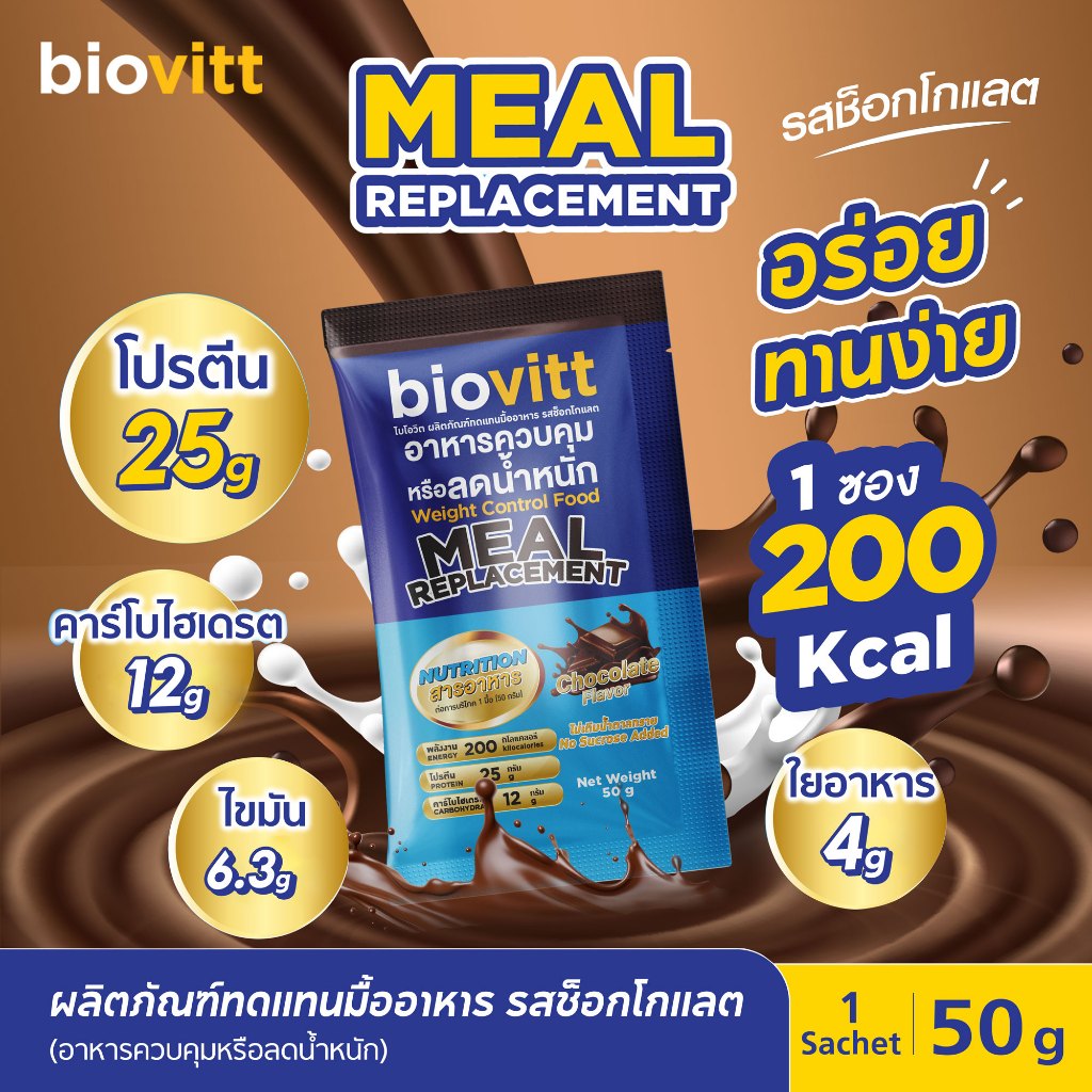 biovitt Meal Replacement ผลิตภัณฑ์ ทดแทนมื้ออาหาร รสช็อกโกแลต อร่อย ทานง่าย ไม่คาว
