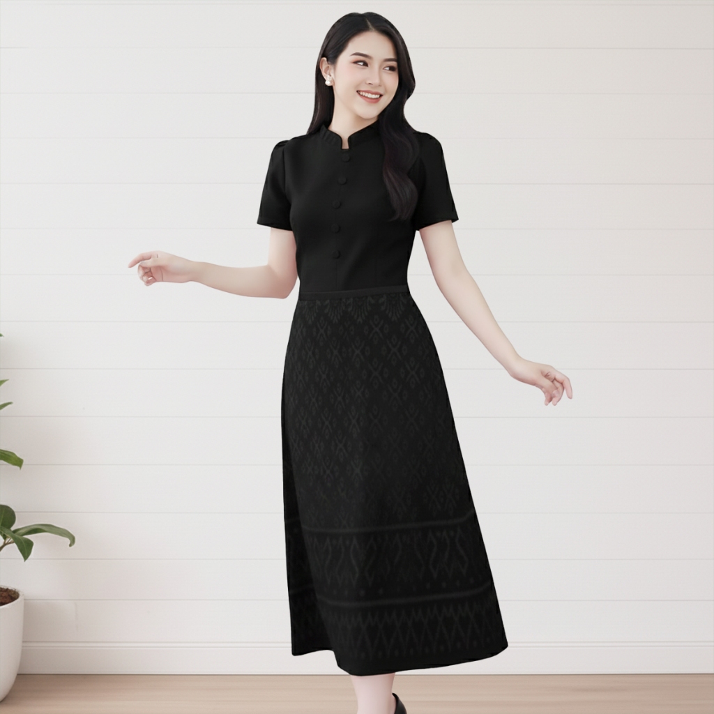 MOCCA's มอคค่า เดรสลายไทยผ้าซอฟท์สูทอัดกาว ทรงคอจีน เหมาะสำหรับออกงาน งานแต่งและโอกาสพิเศษต่างๆ