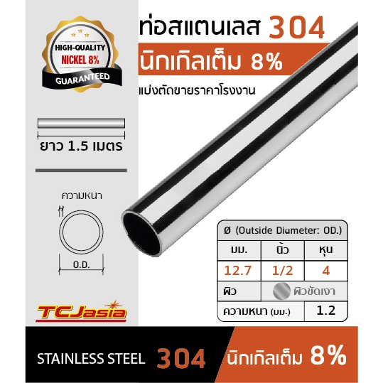 ท่อสแตนเลส 304 ขนาดท่อ 1/2 นิ้ว [12.7 mm.] ยาว 1-1.5 ม. หนา 1.0-1.2 มม. ผิวเงา/แฮร์ไลน์ แบ่งขายมีหลายความยาวให้เลือก