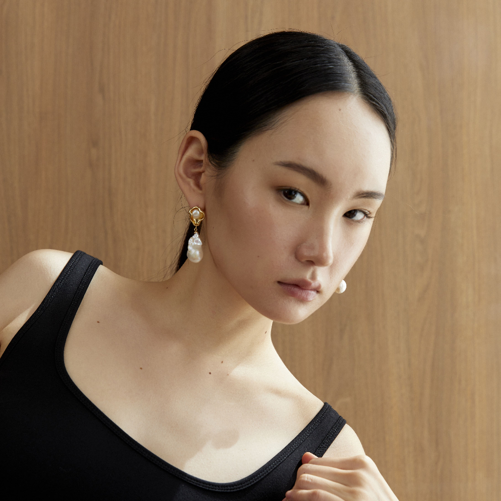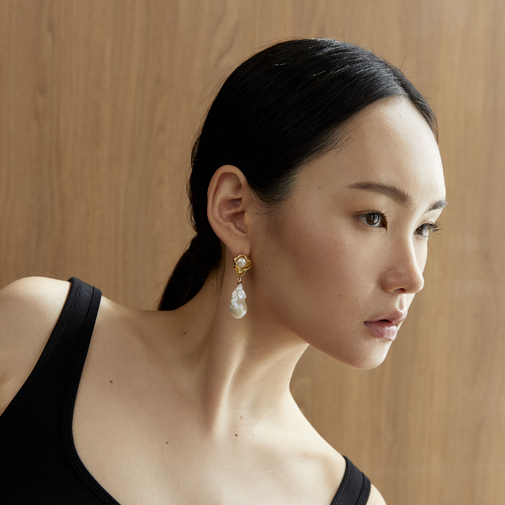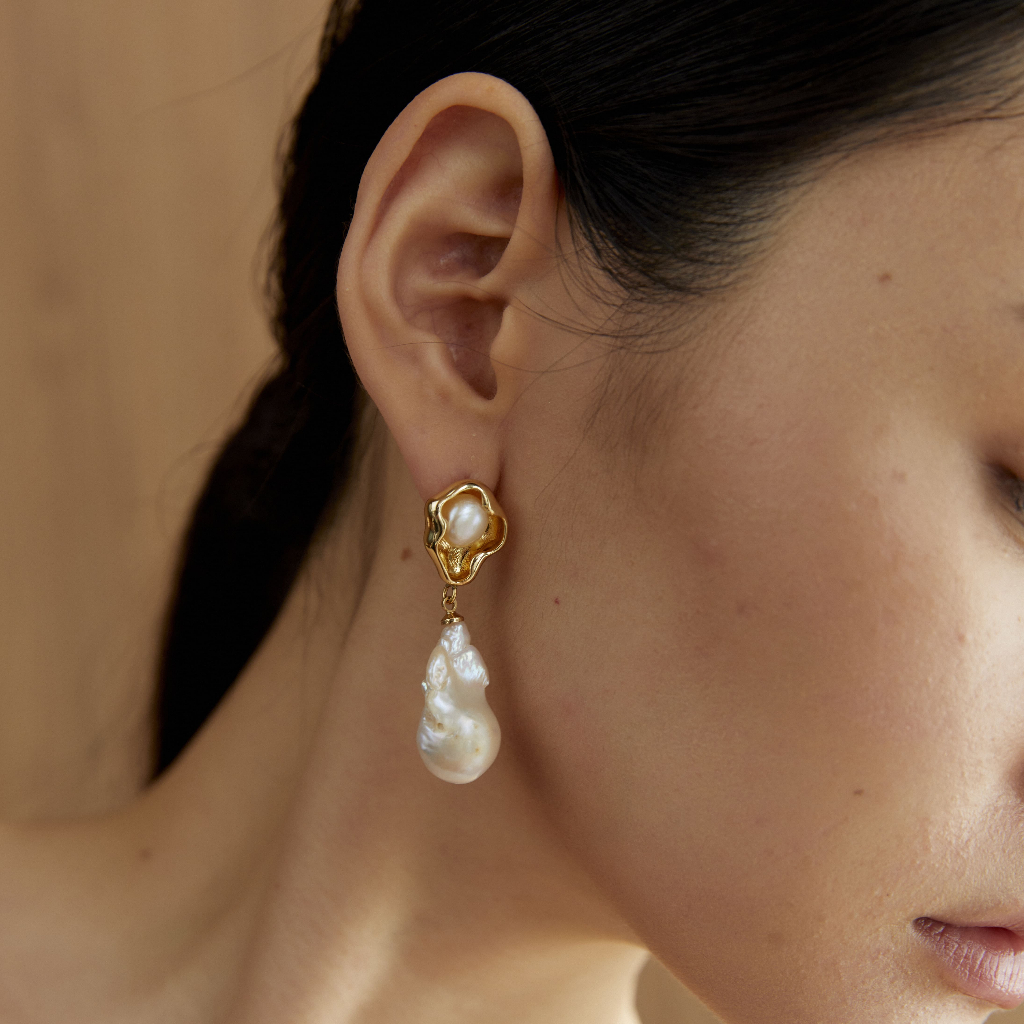 WHITE PEARL OVAL SHAPE GOLD EARRINGS ต่างหูมุกน้ำจืด