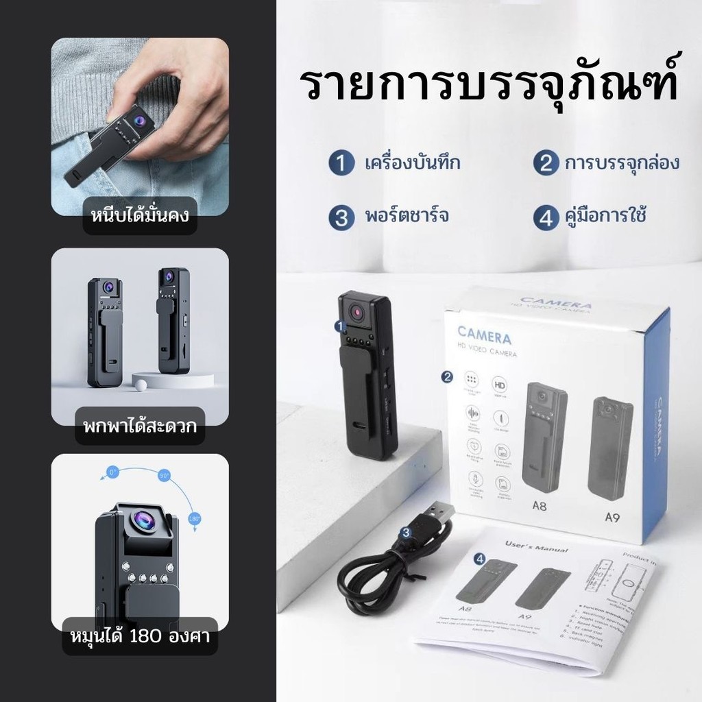 A8 HD Night Vision Back Clip-On กล้องวงจรปิดพกพา กล้องวงจรปิดแบบหนีบ พกพาง่าย บันทึกเสียง กล้องบันทึกวิดีโอไร้สาย