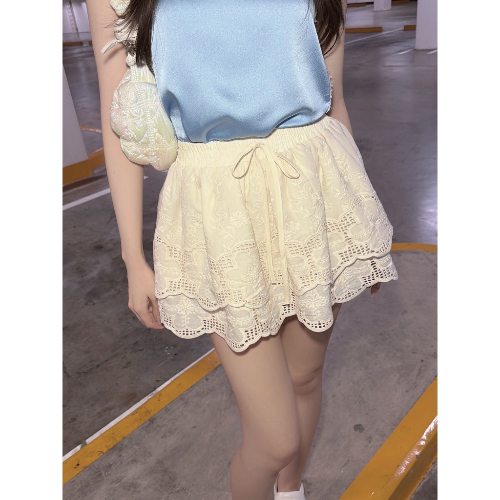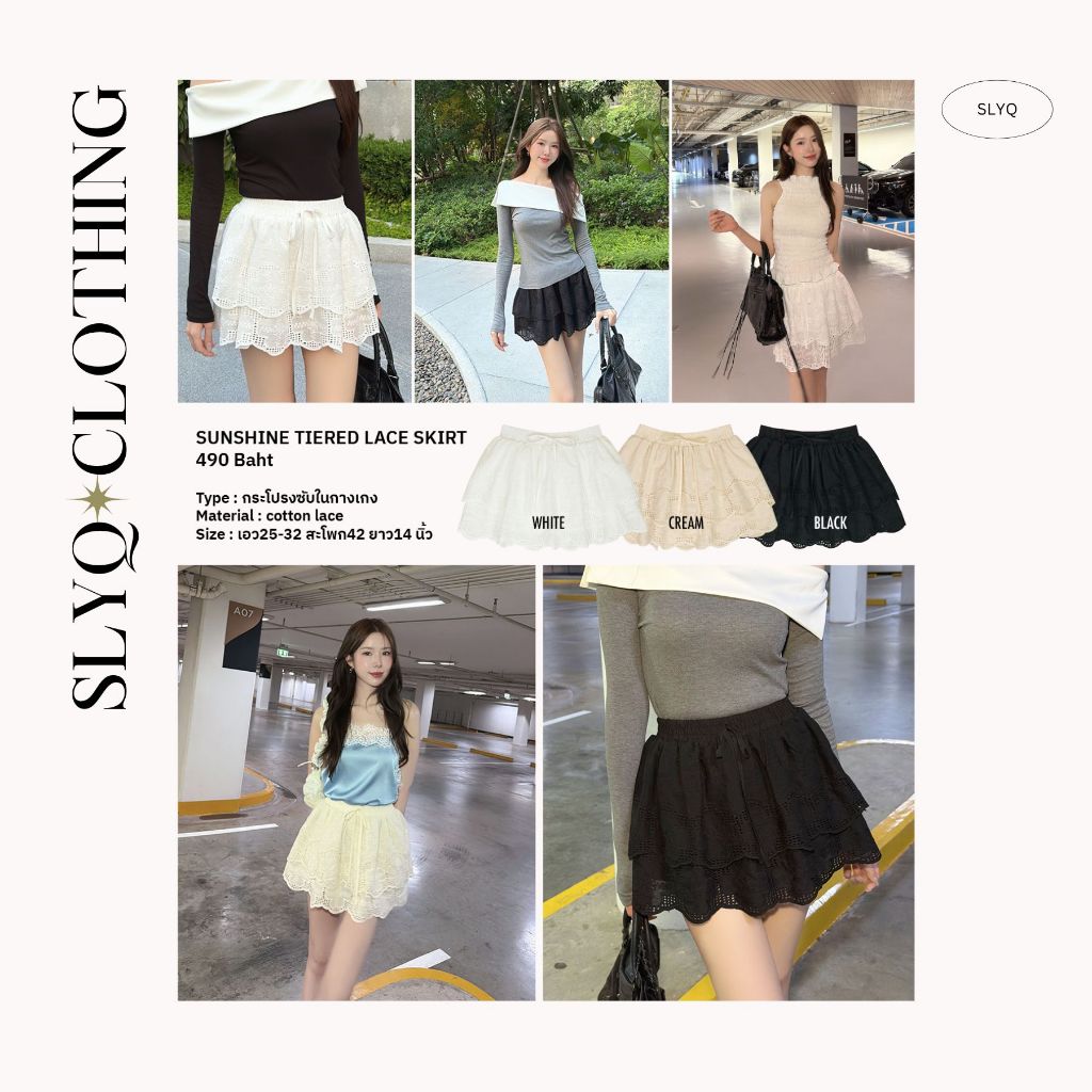 ส่งด่วน🚨 ขาว/ครีม/ดำ SLYQ SUNSHINE TIERED LACE SKIRT กระโปรงลูกไม้ฉลุระบายสองชั้นเอวยางยืด