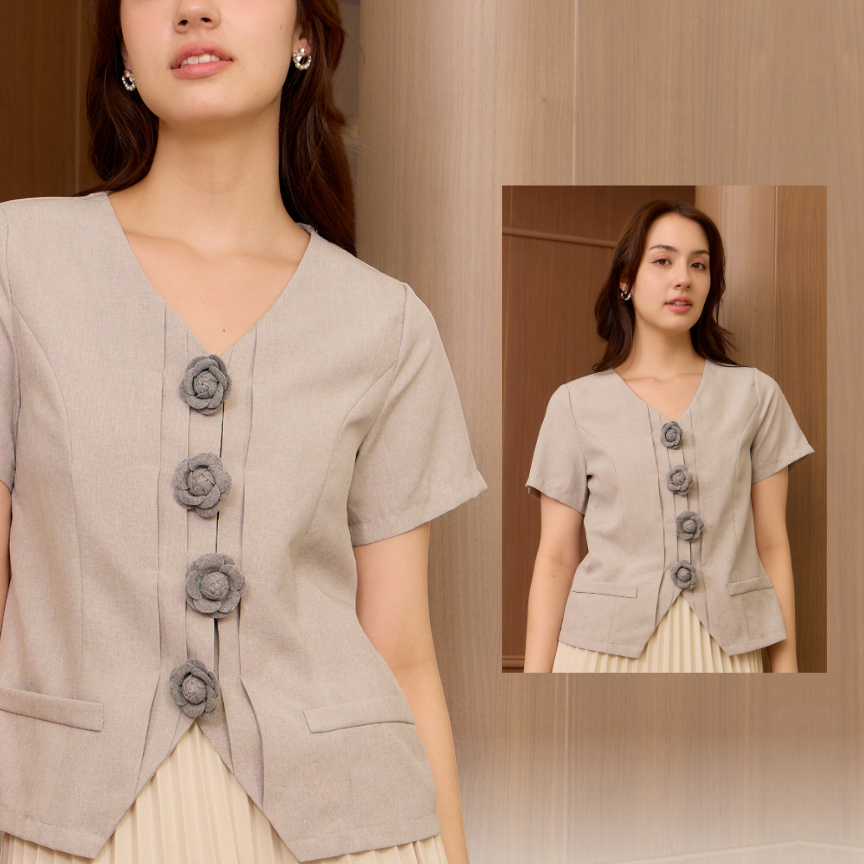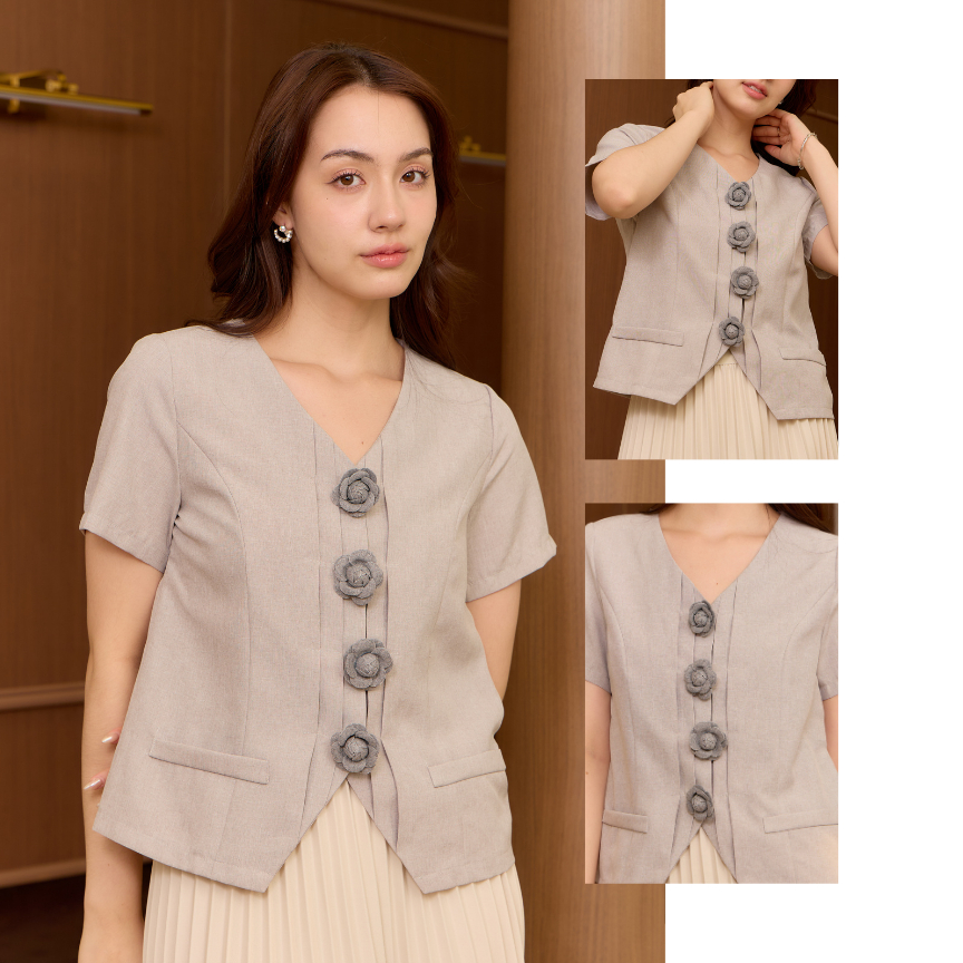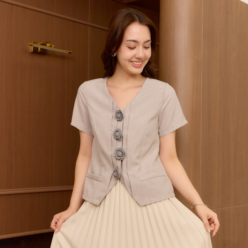 Glucoat | [U998] เสื้อแขนสั้นสีเทา แต่งกระเป๋า 2 ข้าง พร้อมกระดุมแป๊กเข็มกรัดดอกใช้งานได้จริง