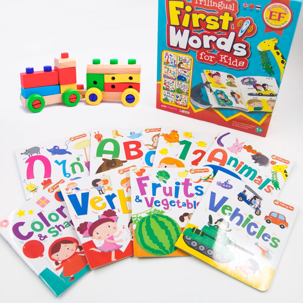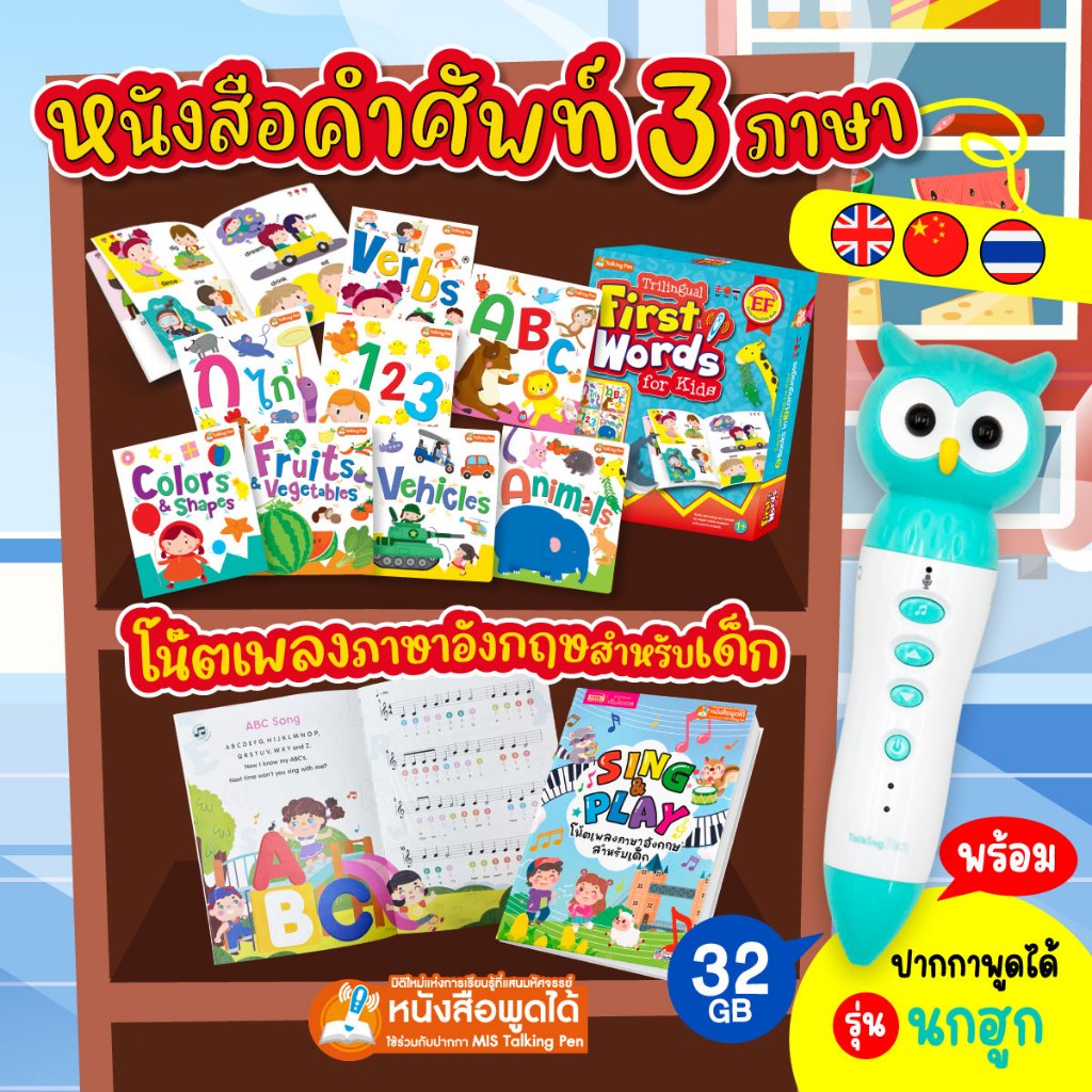 MISBOOK ชุด First Words for Kids 3 ภาษา 8 เล่ม และหนังสือโน้ตเพลงภาษาอังกฤษ มาพร้อมปากกาพูดได้ รุ่นนกฮูก 32 GB