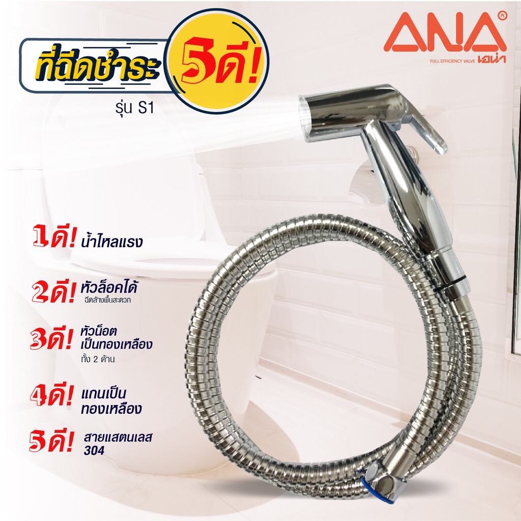 สายฉีดชำระ รุ่น S1 ANA (3141) น็อตทำจากทองเหลืองแท้ สายแสตนเลส แข็งแรงทนทาน ไม่รั่ว ไม่แตกหักง่าย หัวฉีดล็อคได้