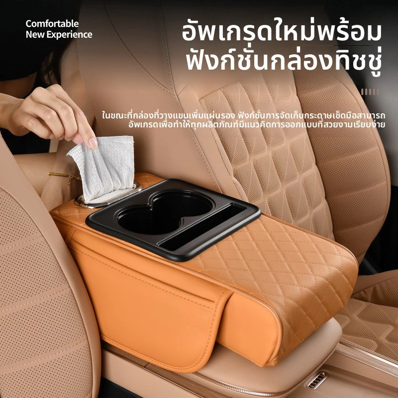 เบาะรองนั่งที่เท้าแขนคอนโซลกลาง เบาะที่เท้าแขนรถยนต์ 4-in-1 ทั่วไป วัสดุ PU ทนทาน ฟองน้ำหนา มีกล่องทิชชูและที่วางแก้ว