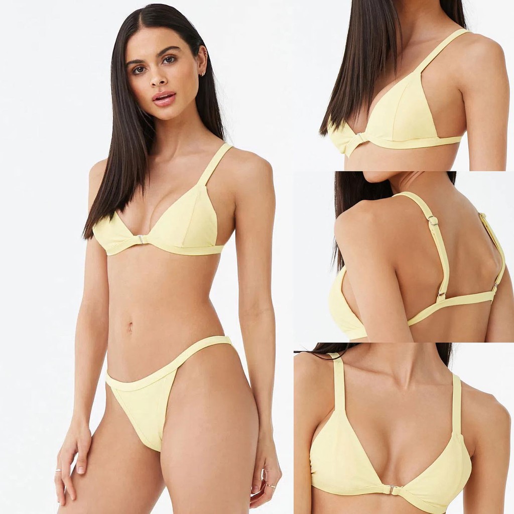 บิกินี่ทรงสามเหลี่ยมสีพื้นทรงไฮคัต ดีเทลบราเป็นตะขอเหล็กด้านหน้า สายสามารถปรับระดับได้