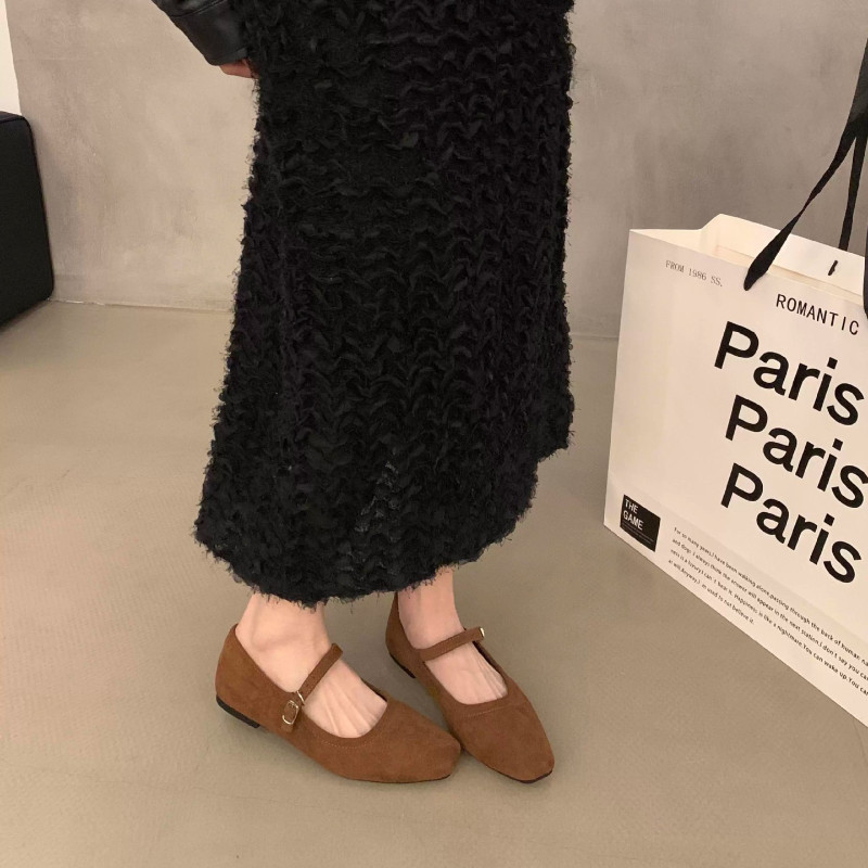 รองเท้าแฟชั่นแมรี่เจนสำหรับผู้หญิง รองเท้าส้นแบนหัวเหลี่ยม วัสดุหนังกลับ สไตล์ย้อนยุค