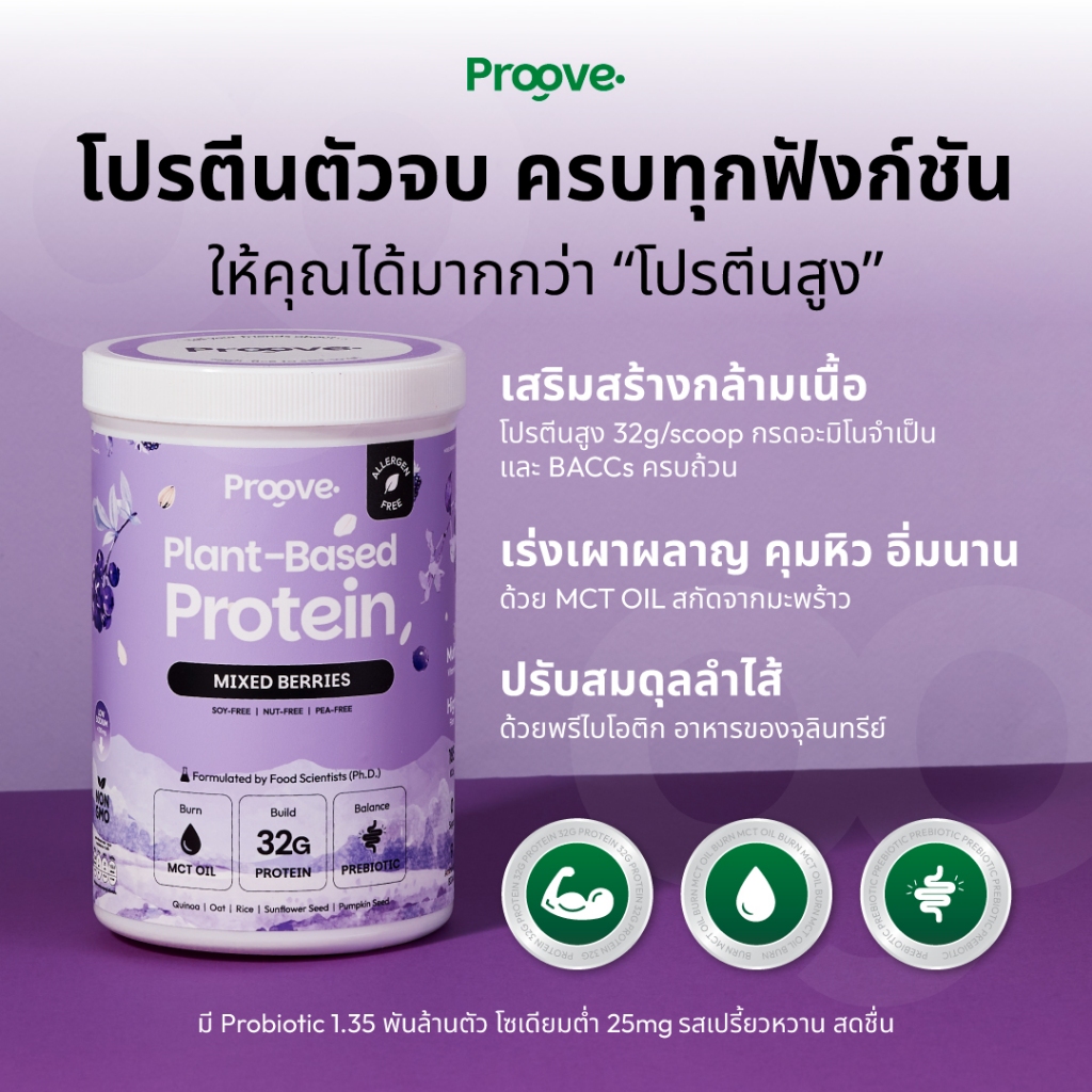 Proove โปรตีนพืช รสมิกซ์เบอร์รี (Mixed Berries) สารสกัดจาก ตระกูลเบอร์รี่รวม 3 ชนิด มี Probiotic 1.35 พันล้านตัว