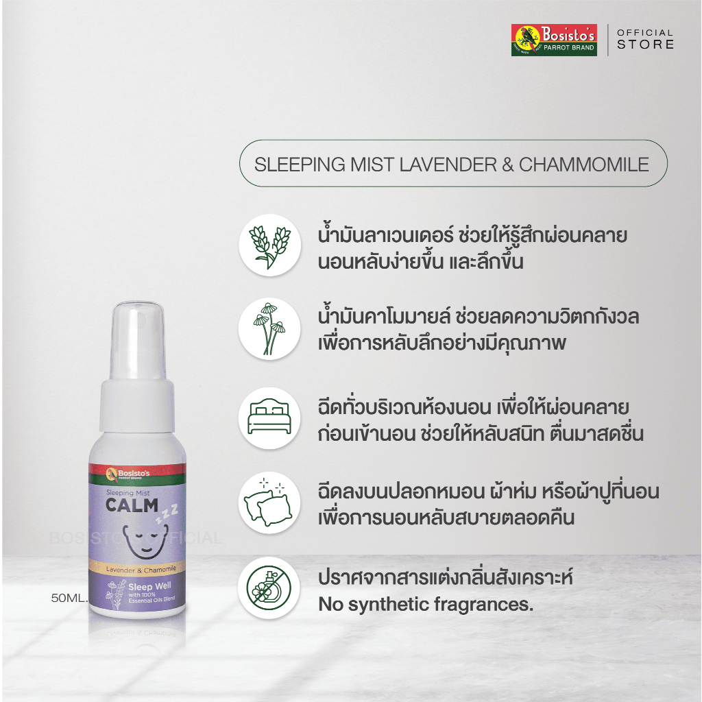 Bosisto ตรานกแก้ว Sleeping Mist สเปรย์ฉีดหมอนหลับสบาย กลิ่นลาเวนเดอร์ผสมคาโมมายด์ 50 ml.