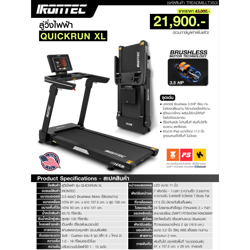 ลู่วิ่งไฟฟ้า QUICKRUN XL (T350) - เครื่องออกกำลังกาย แบรนด์ IRONTEC