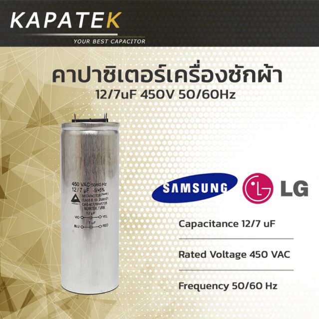 คาปาซิเตอร์เครื่องซักผ้า 12/7uF ใช้กับ Samsung และ LG Capacitor 12/7 ไมโคร ซีเครื่องซักผ้า อะไหล่แท้