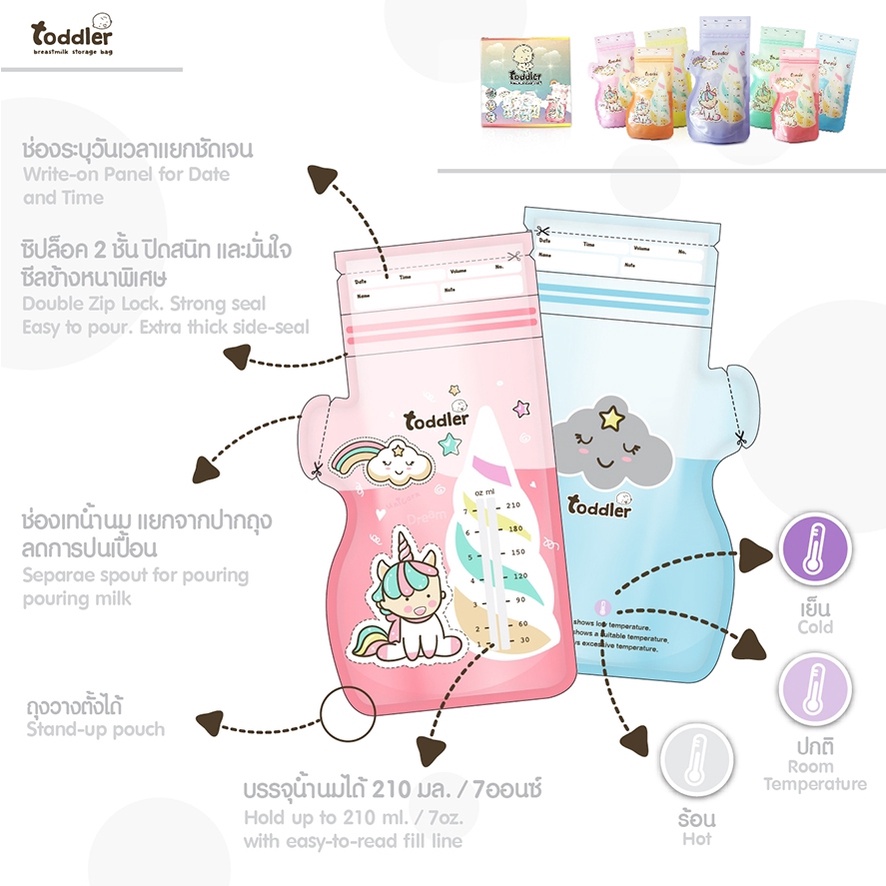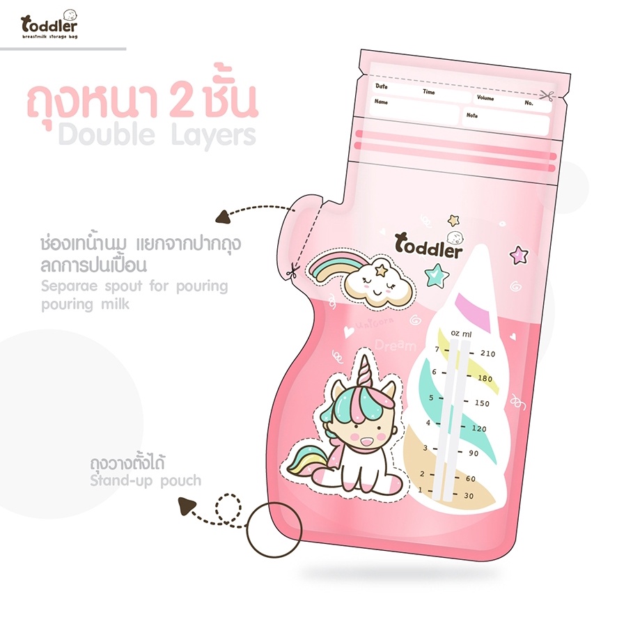 (12กล่อง) Toddlerfamily ถุงเก็บน้ำนม ขนาด 7 Oz. (35ใบ) รุ่น Unicorn หนา2ชั้น กันหืน ก้นตั้ง มี 7 สี