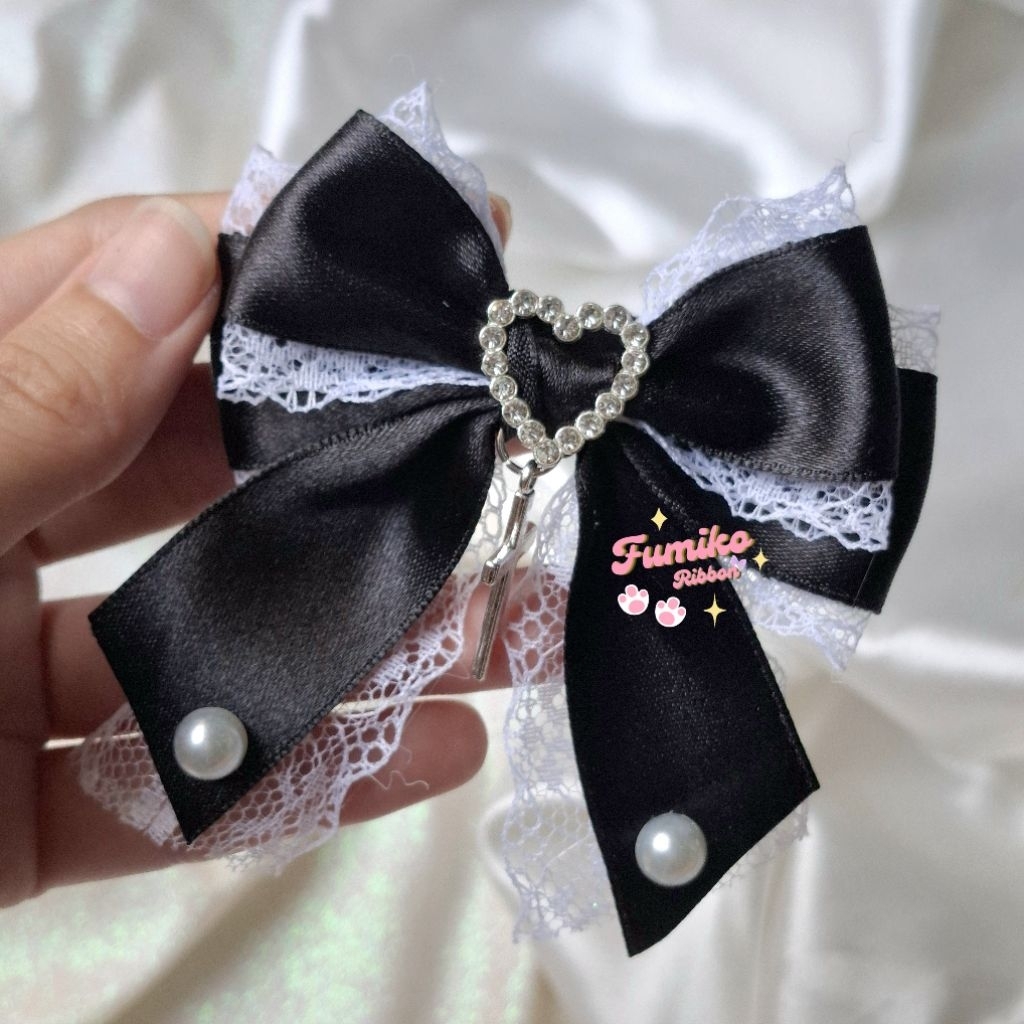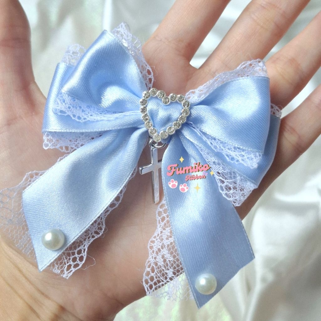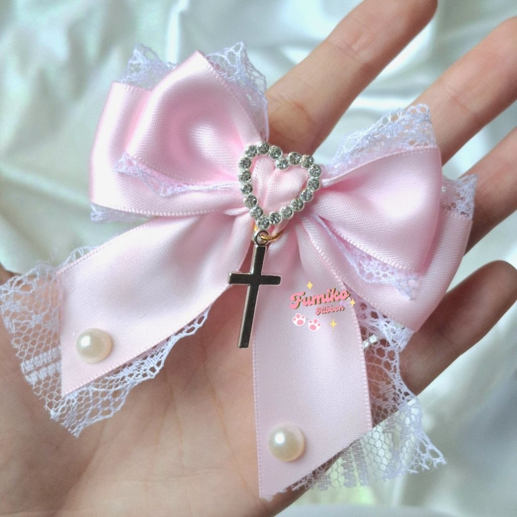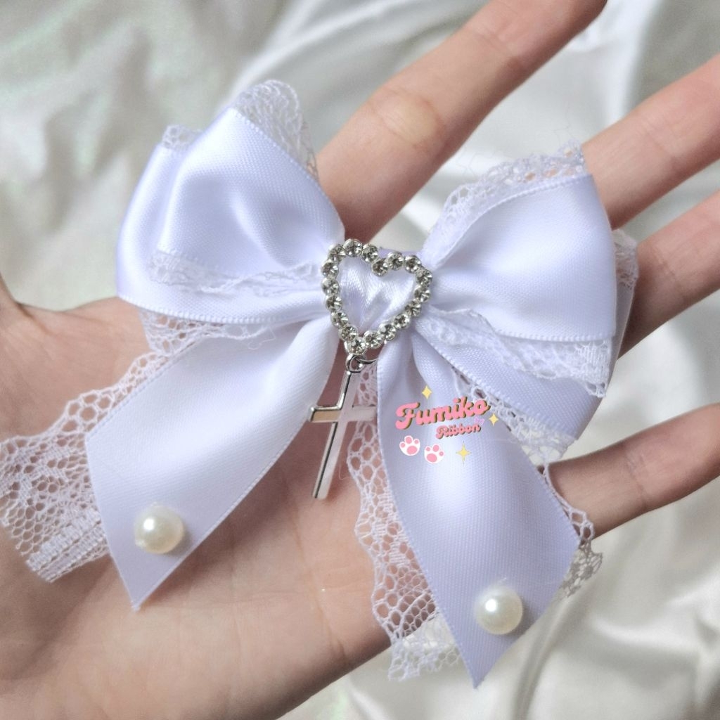โบว์เล็กๆน่ารักๆลูกไม้ขาว จี้ห้อยกางเขน ขนาด 3 นิ้ว เปลี่ยนสีทักแชทคุย
