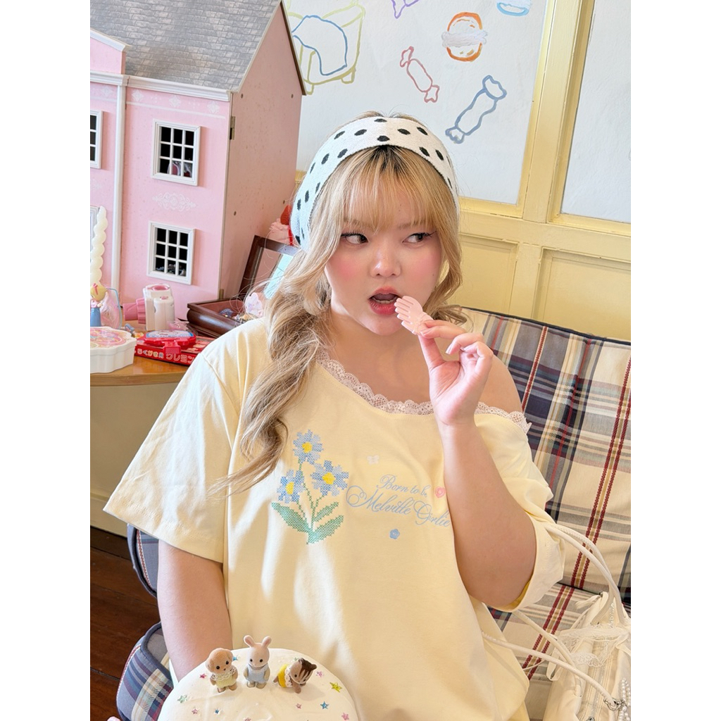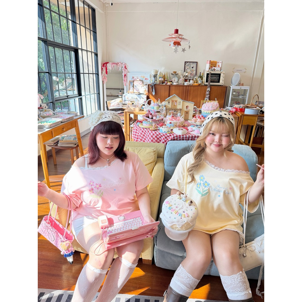 Fleur shoulder laceꕤ˖⸝⸝₊˚🪽🎀”เสื้อโอเวอร์ไซส์ปาดไหล่น้องสกรีนน้องดอกไม้พิกเซลลายน่ารักมาก “