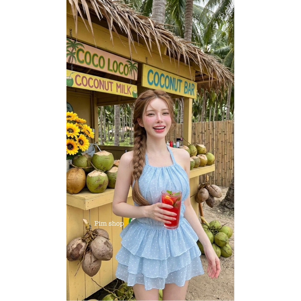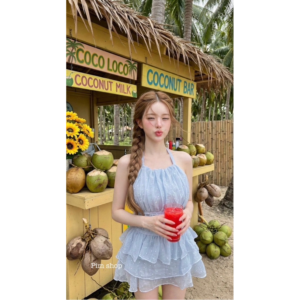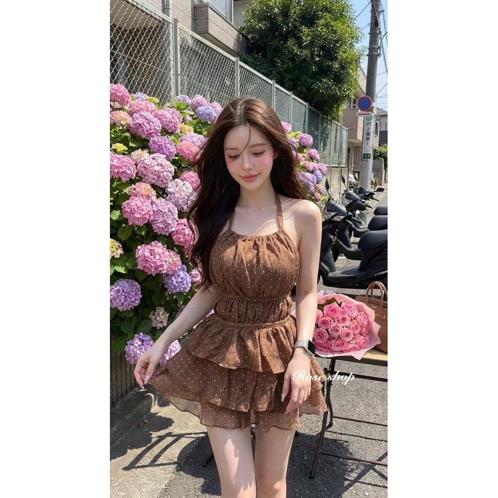 #Roseshop Set2ชิ้นเสื้อคล้องคอผูกหลัง มาคู่กับกระโปรงชั้นระบายนำเข้า ผ้า มี ซับในกางเกง