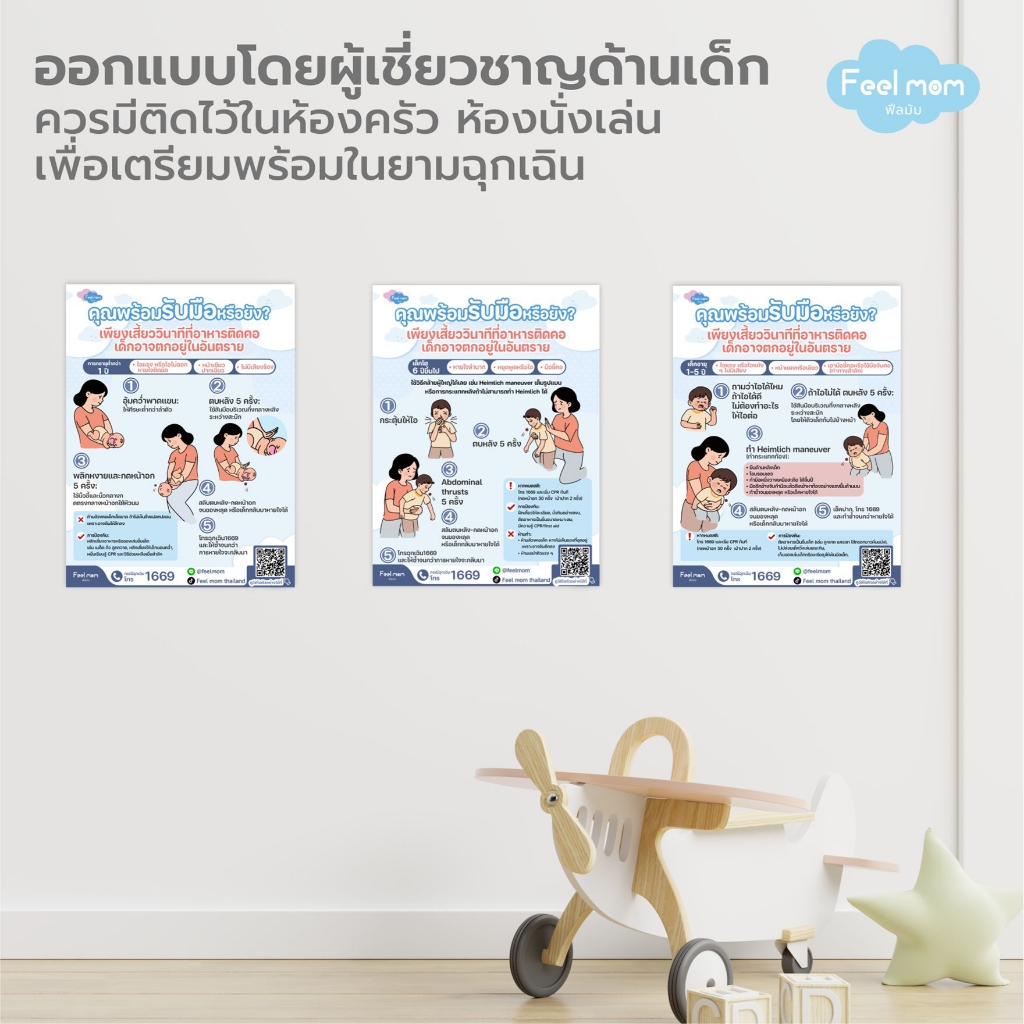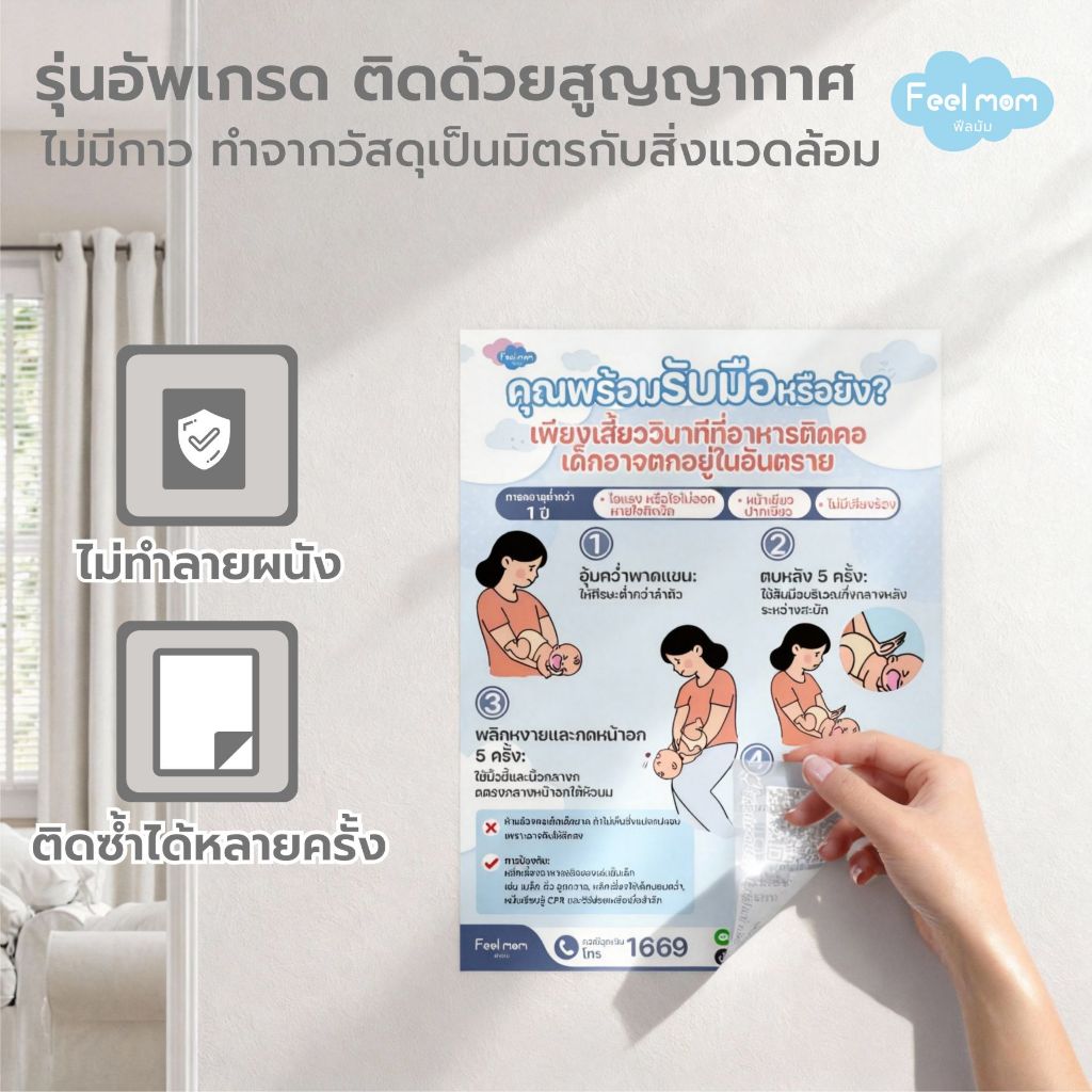 โปสเตอร์ติดผนัง สอนวิธีช่วยลูกอาหารติดคอ | คู่มือพ่อแม่แบบเร่งด่วน Feel Mom
