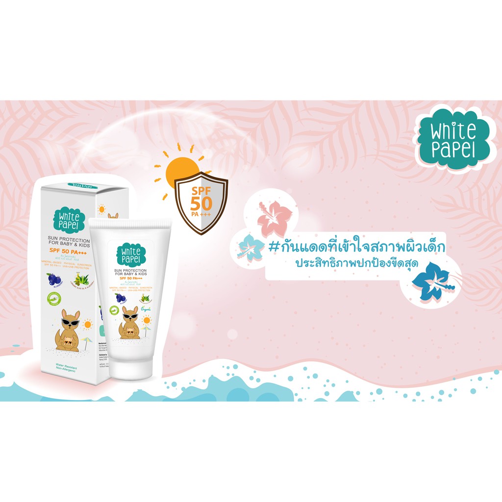White Papel(ไวท์พาเพล) ครีมกันแดดเด็ก ออร์แกนิค ซึมไว เกลี่ยง่าย ปกป้องนานทั้งวัน SPF 50 Pa+++ 50ml.