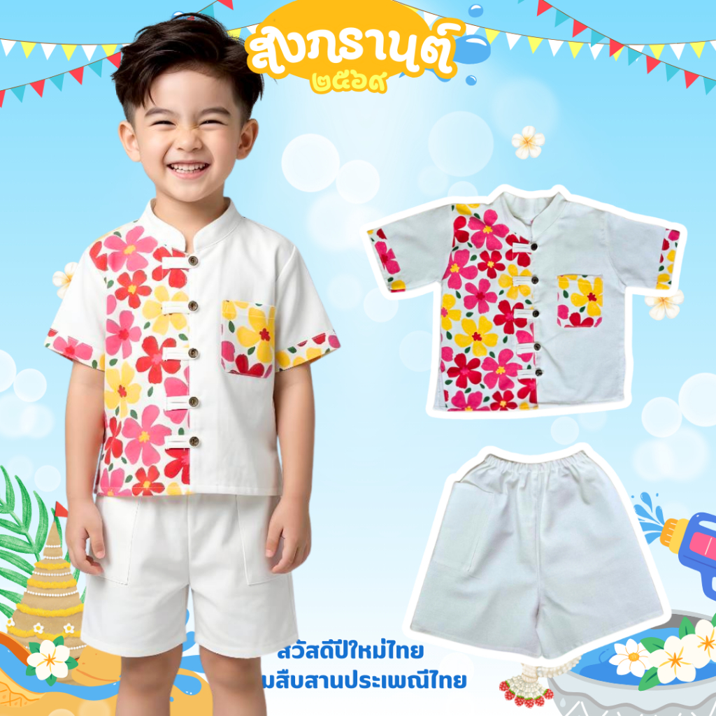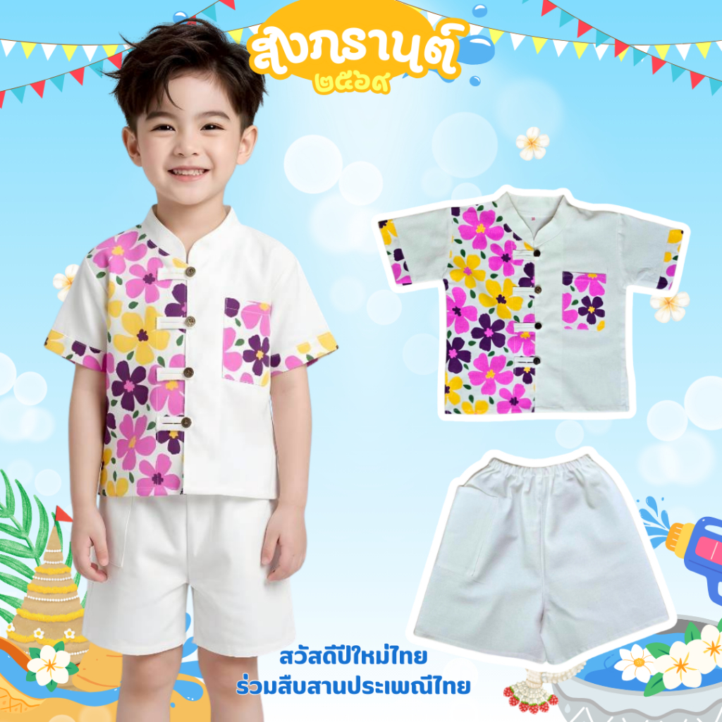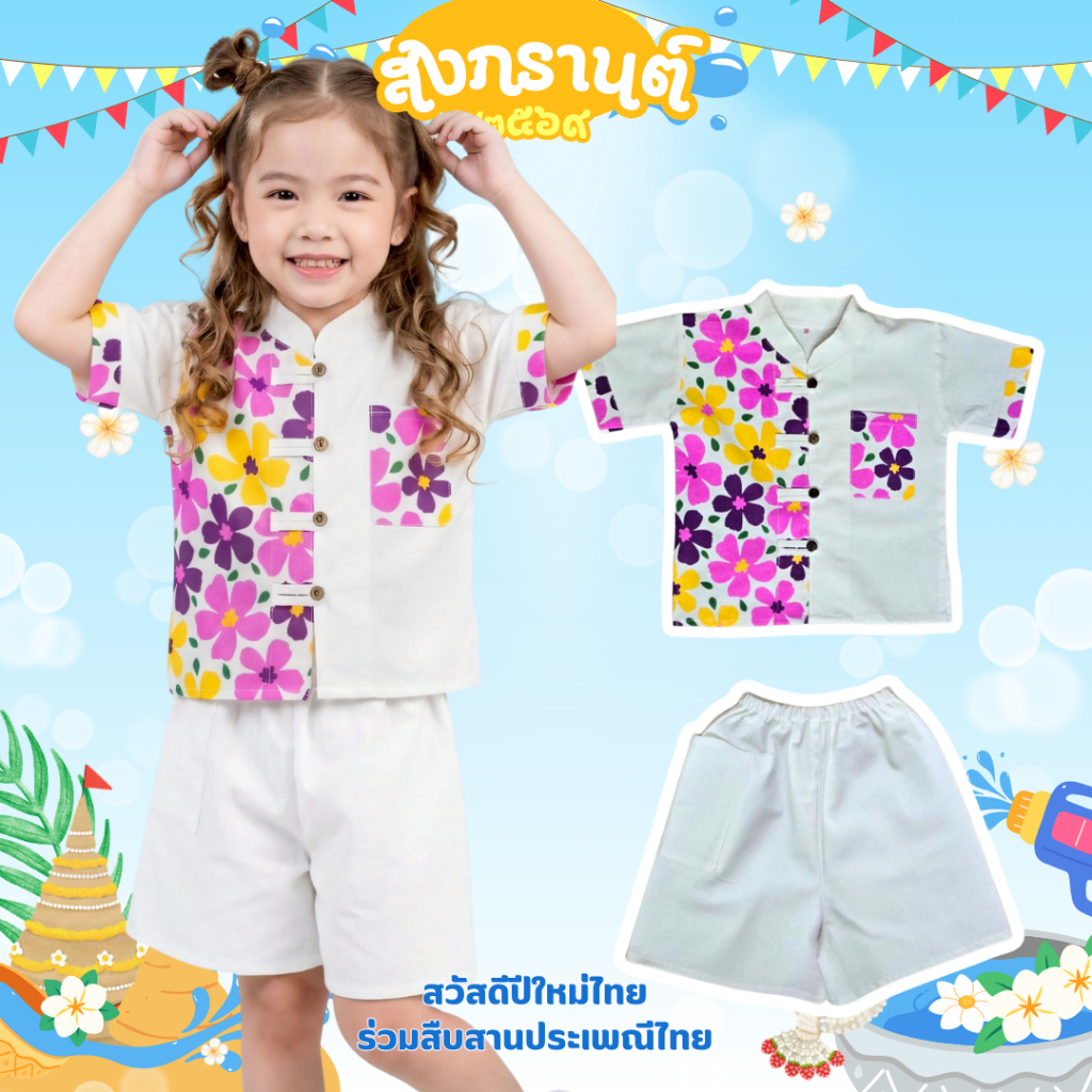 ชุดพื้นเมืองเด็กลายดอก วันสงกรานต์ ผ้าฝ้ายเนื้อนุ่ม ใส่สบาย ไม่ร้อน เหมาะกับอากาศบ้านเราสุดๆ