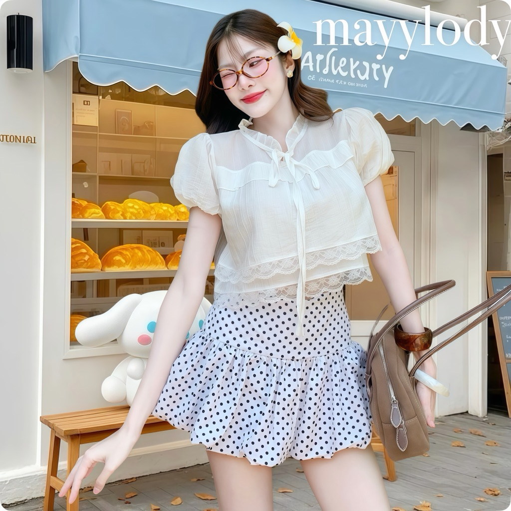 💓mayylody💓 SUMMER TOP ครอปท็อป แขนพองบอลลูน แต่งชายระบายลูกไม้ โซคิ้ววว สไตล์เกาหลี ( อก -38 ) 🌷🪞🌤️🍃 เสื้อครอป ครอป