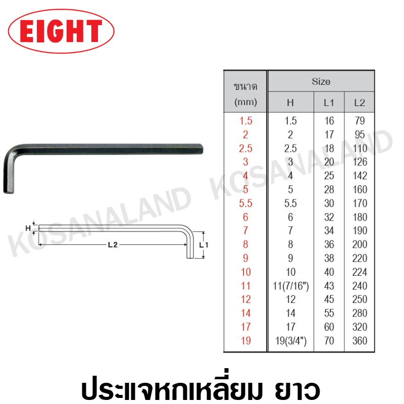 Eight ประแจหกเหลี่ยม ตัวยาว สีดำ (ตัวเดี่ยว) / กุญแจหกเหลี่ยม ประแจแอล (Hex Key) (มีขนาด 9 - 17 มม. ให้เลือก)