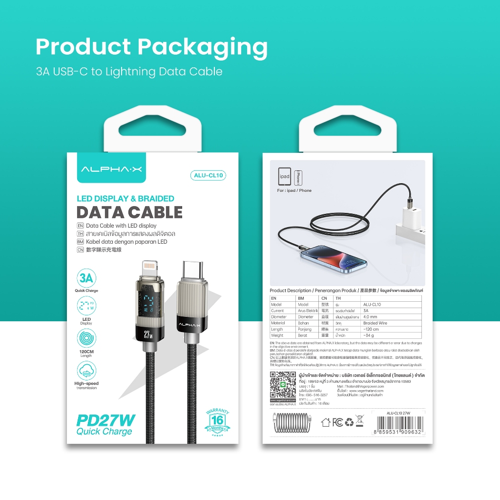 ALPHA.X สายชาร์จ USB-C to Lightning Cable 27W 1.2M Black (ALU-CL10)