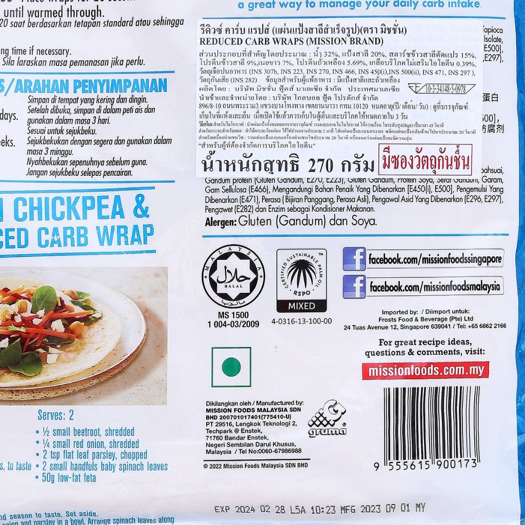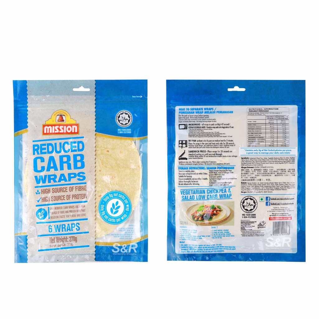 Low Carb Wraps Mission แป้งแรป reduced carb โปรตีนสูง ไฟเบอร์สูง (6 แผ่น / 270g) ฮาลาล