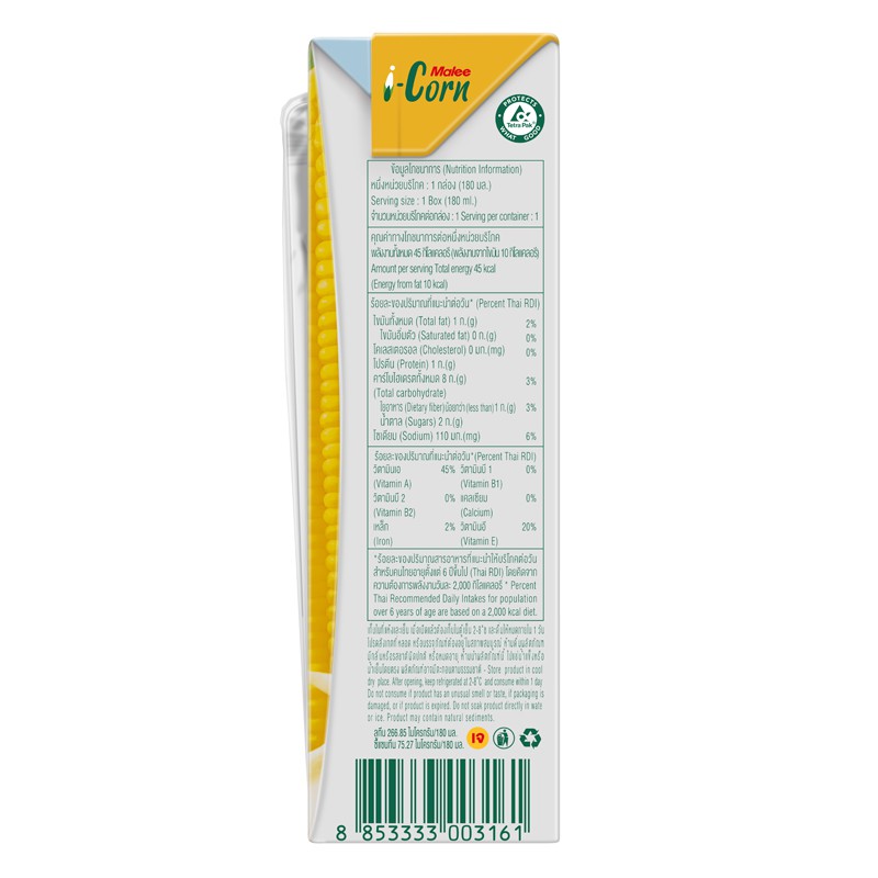 [ยกลัง! 24 กล่อง] Malee ไอคอร์น น้ำนมข้าวโพด 100% สูตรไม่เติมน้ำตาล ขนาด 180 มล.