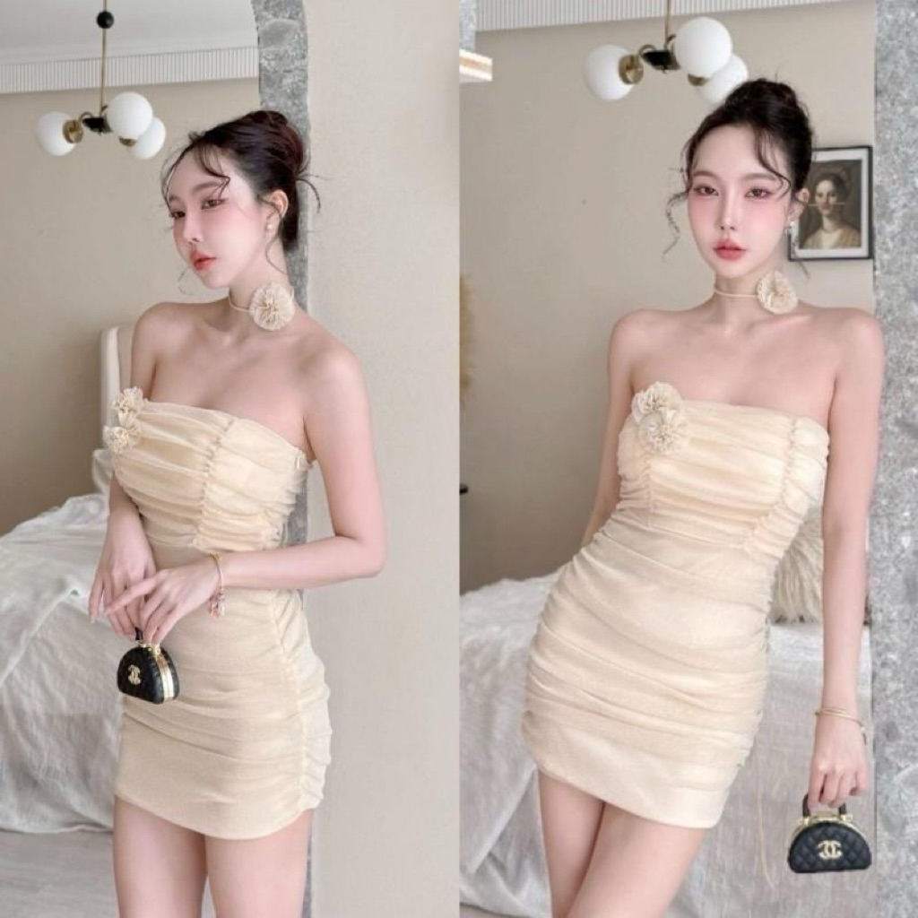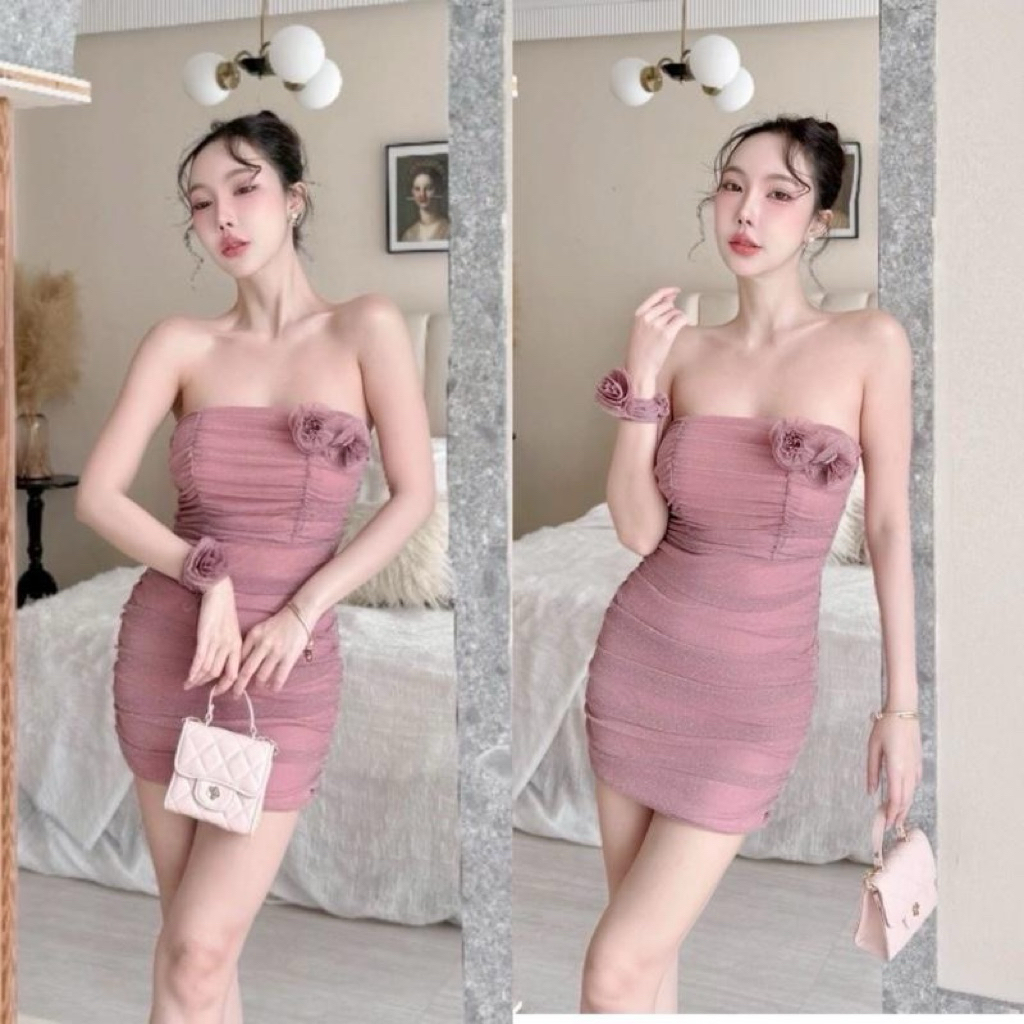เดรสทรงเกาะอกแต่งจับจีบย่นทั้งตัว โชคเก้อดอกไม้ SR