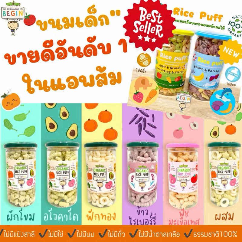 (ส่งด่วน/ส่งทันที🔥) BEGIN Rice puff (แบบกระปุกสุดคุ้ม)ขนมข้าวผสมผักอบกรอบสำหรับเด็ก ขนมเด็ก ออแกนิค