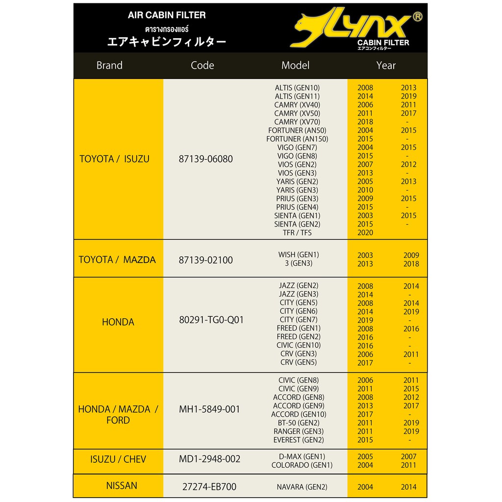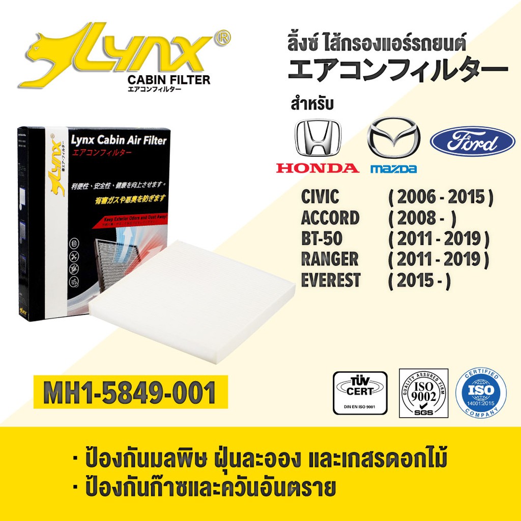 LYNX Air Cabin Filter ไส้กรองแอร์ Honda Civic, Honda Accord, Mazda BT-50, Ford Ranger, Ford Everest