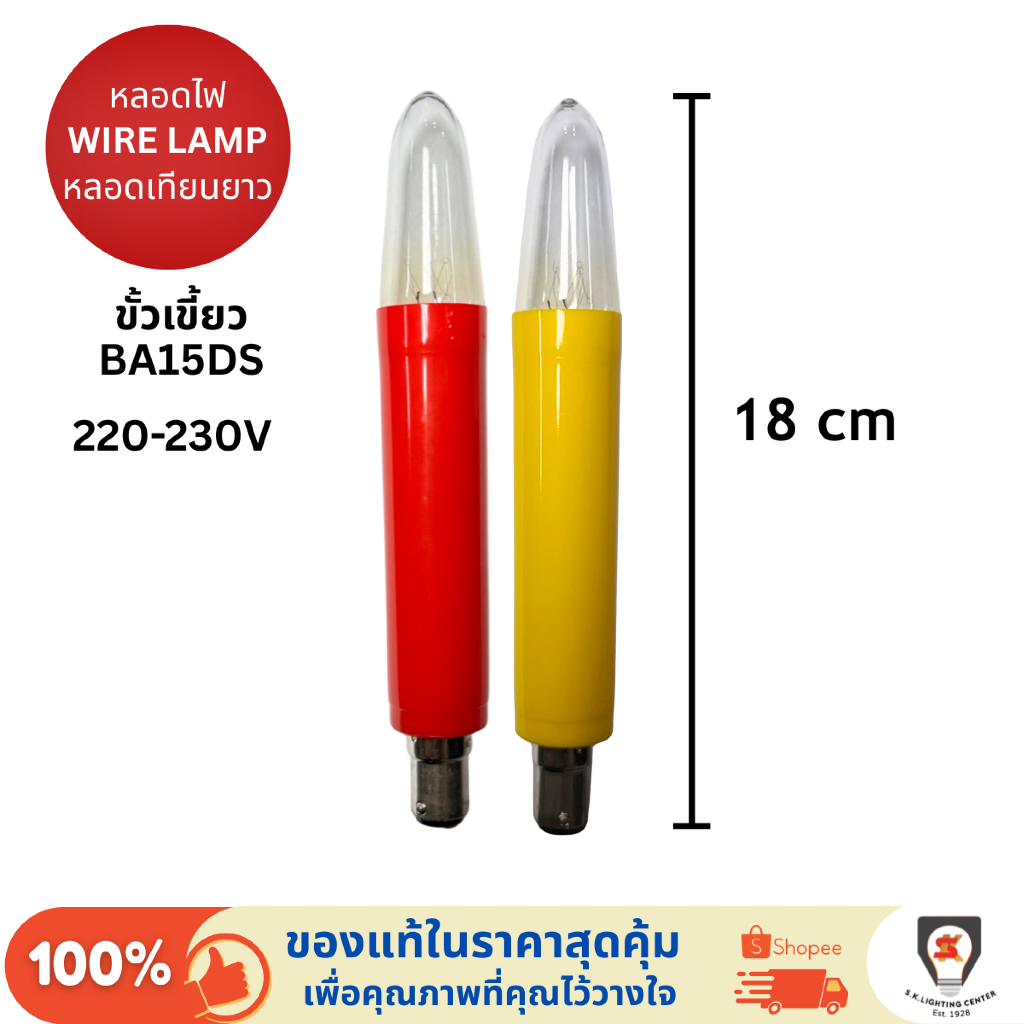 Wire lamp หลอดเทียน ยาว 18 cm. ขั้วเขี้ยว BA15DS หลอดไฟศาลเจ้า 220-230V สีแดง Red / สีเหลือง Yellow