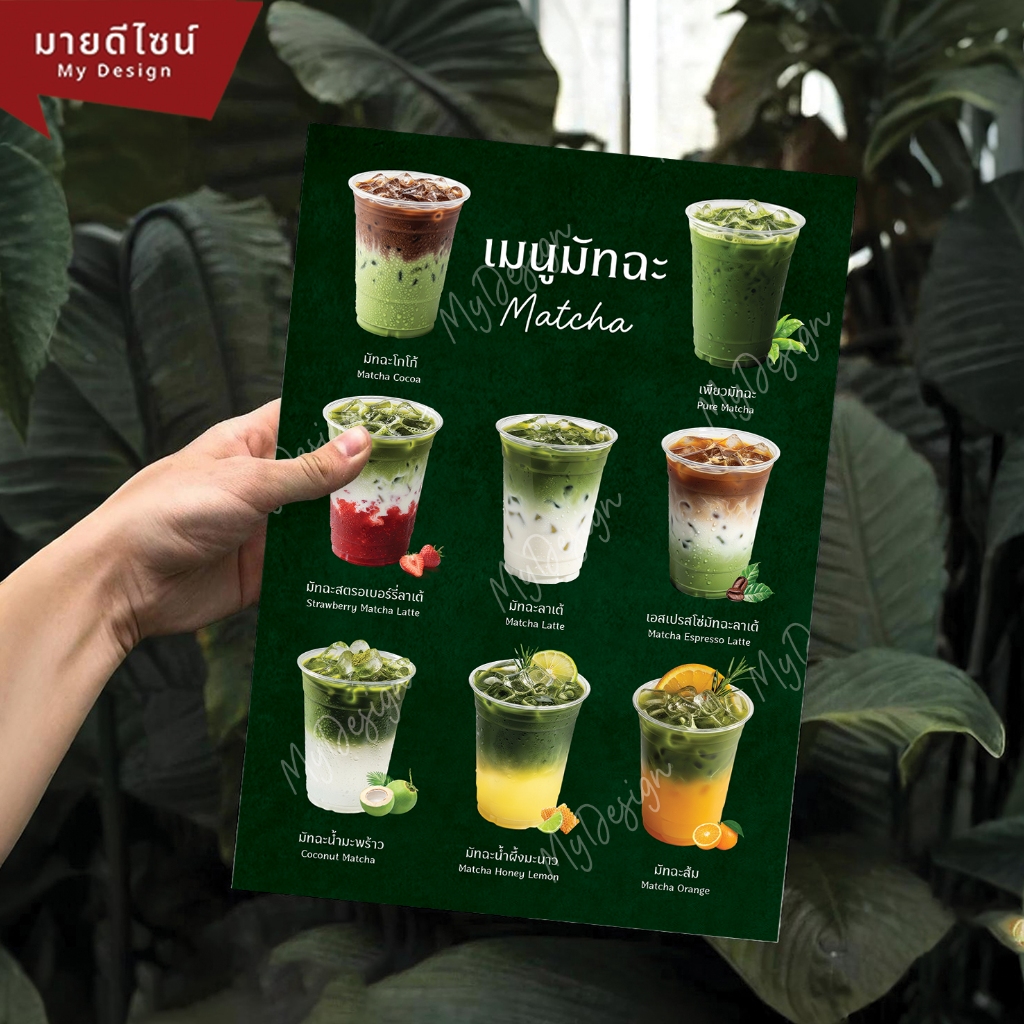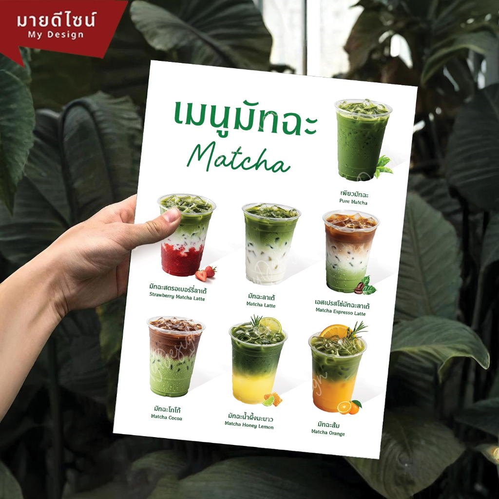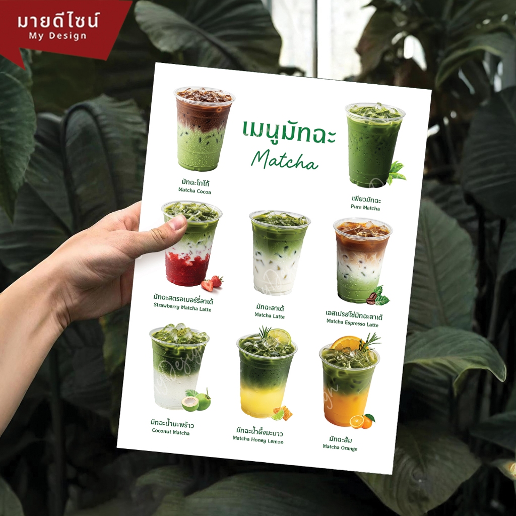 ป้ายเมนูเครื่องดื่มชาเขียวมัทฉะ สี ขาว/ดำ ขนาด A4/A3 เคลือบใสกันน้ำ!