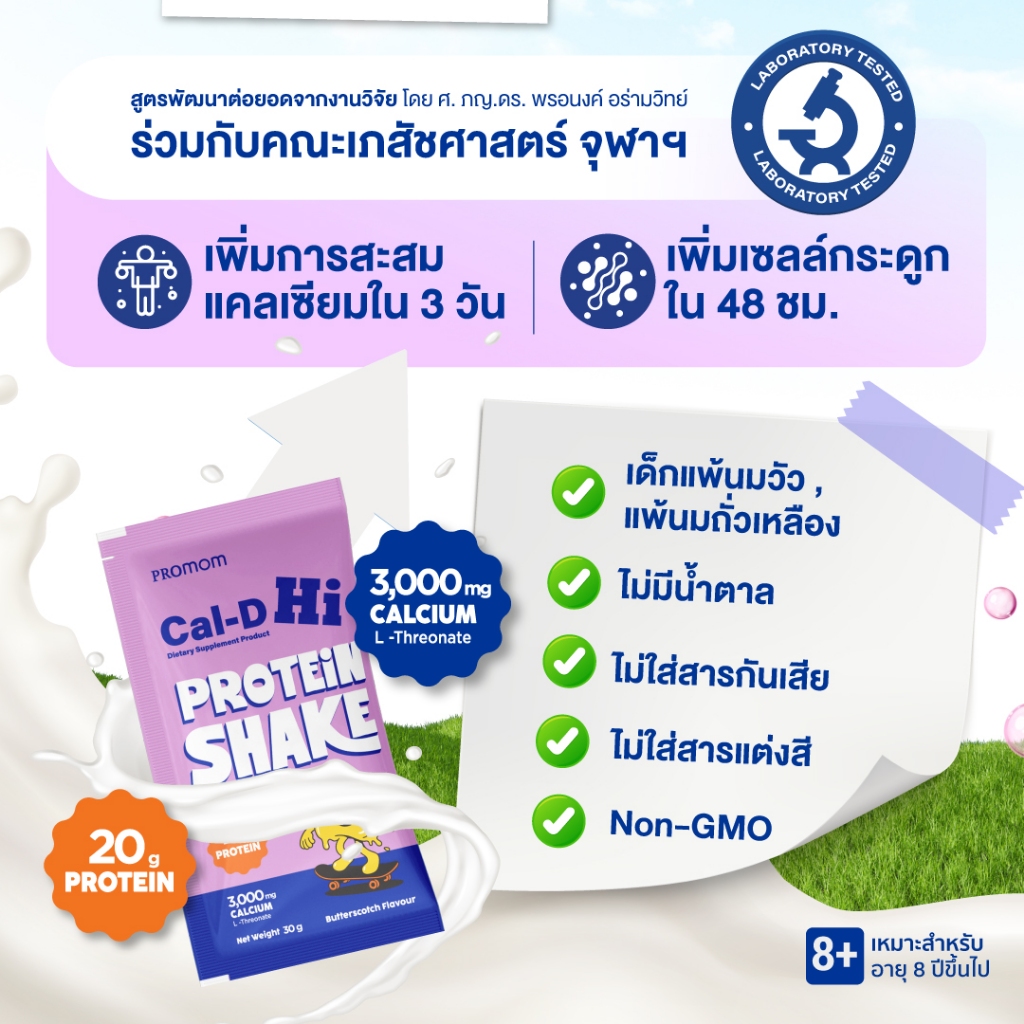 【6 กล่อง】Promom Cal-D Protein Shake โปรตีนเชคเร่งสูงโค้งสุดท้าย (อายุ 8 ปี+ รส Butterscotch) แก้วคละสี