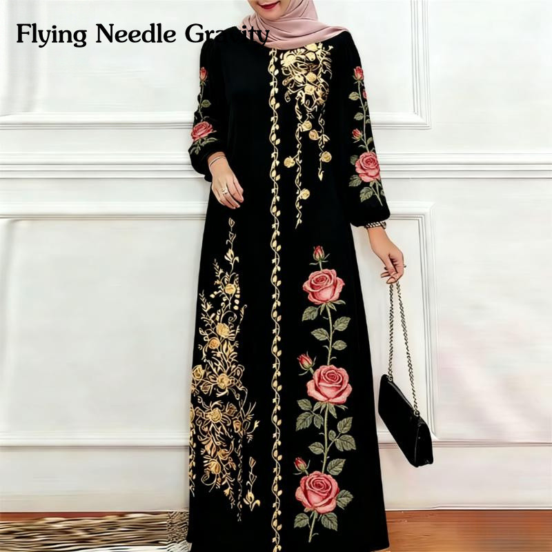 เสื้อผู้หญิง รายา,แสงหรูหรามุสลิมอาบาย่า,ประดด้วยเย็บปักถักร้อยกุหลาบดํา3ง,ฝีมือจากซิลกี้และผ้ากํามะหยี่แต่งตัวบวกรายละเอียดดอกไม้ปักทองประณีต