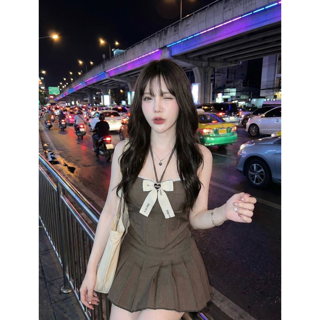 Phapassz - เซต2 ชิ้น เกาะอกคล้องคอแต่งลูกไม้ เสริมฟองน้ำ ติดเข็มกลัดแบร์นดัง มาพร้อมกระโปรงจีบหน้า มีซับใน #Roseshop
