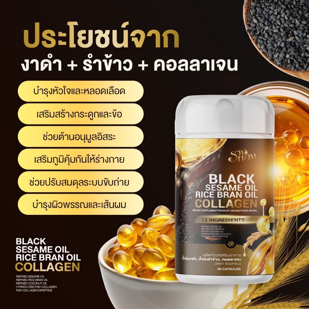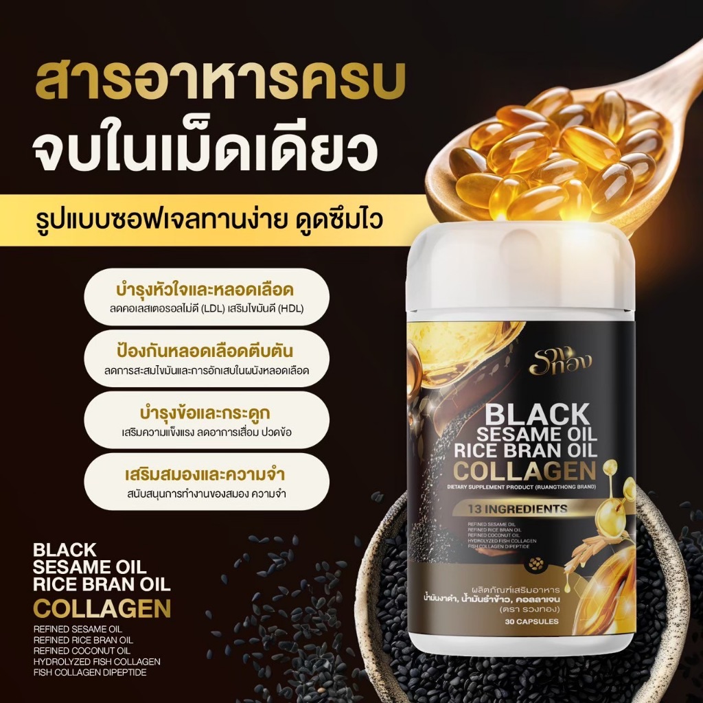 2แถม2 [ของแท้] รวงทอง Blacksesame Oil น้ำมันงาดำรำข้าวผสมคอลลาเจน บำรุงข้อเข่า ระบบขับถ่าย และผิวพรรณ 1กระปุก30เม็ด