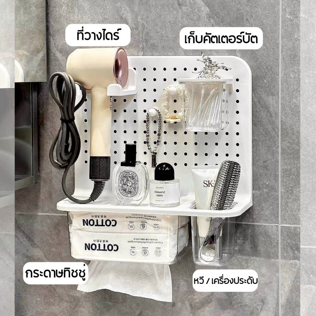 ชั้นวางไดร์ ที่แขวนไดร์ ติดผนัง แบบ 3IN1 ใส่ทิชชู่ วางไดร์เป่าผม วางของอเนกประสงค์ได้ ไม่ต้องเจาะผนัง🍒ชุดสุดคุ้ม🍒