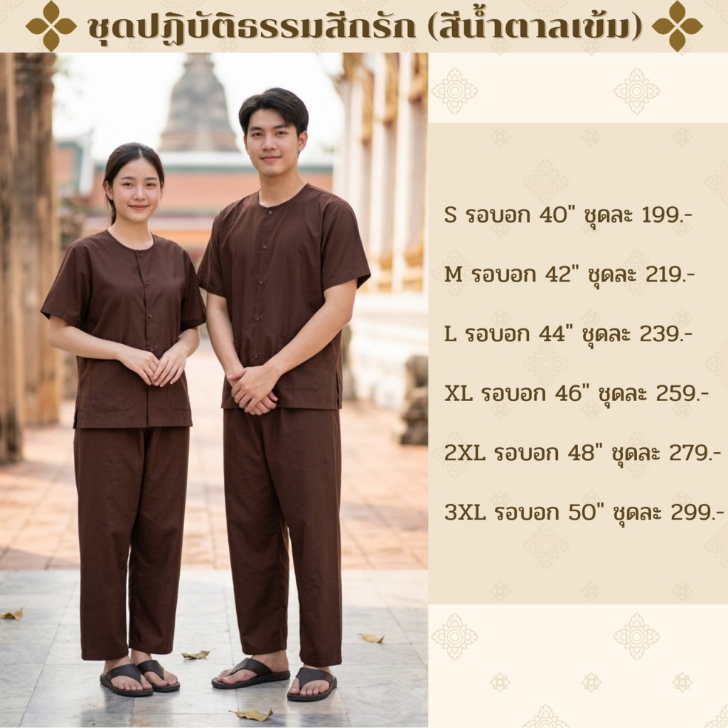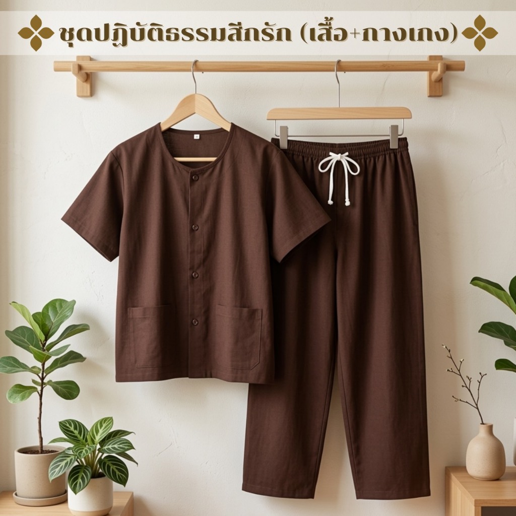 ชุดปฏิบัติธรรมผ้าฝ้ายโทเรสีน้ำตาลเข้ม (สีกรัก) ได้ทั้งชุด (เสื้อ+กางเกง) ผ้าฝ้ายโทเรยิ่งซักยิ่งนิ่มใส่ได้ทั้งชายและหญิง